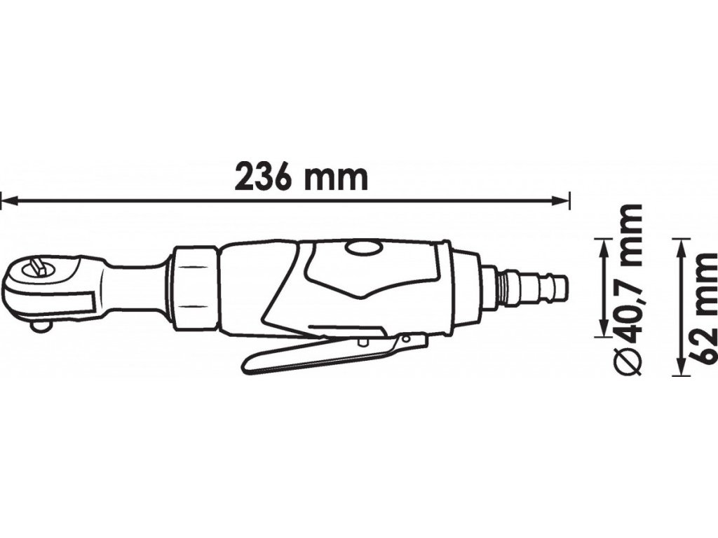 Pneumatický mini ráčnový utahovák 1/4" s maximálním utahovacím momentem 35,2 Nm a celkovou délkou 236 mm.