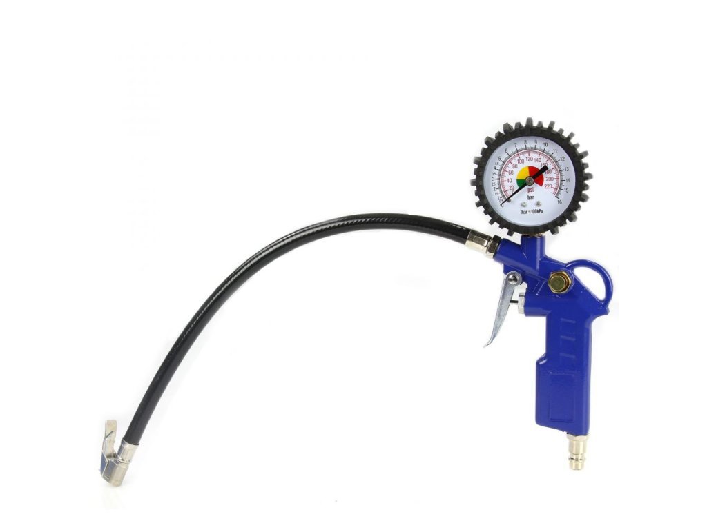 - Nafukovací pistole s manometrem je ideální pro nahuštění a kontrolu tlaku v pneumatikách. Je vybavena odvzdušňovacím ventilem.