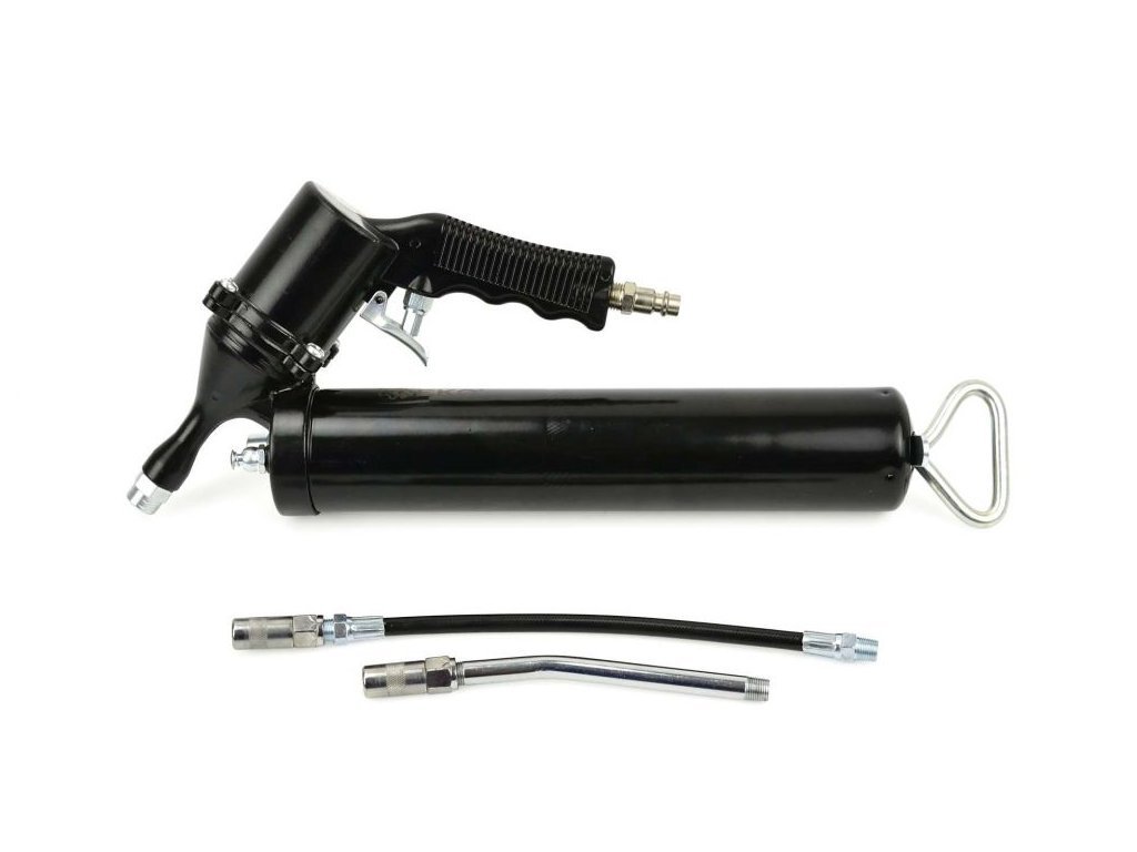 Pneumatický ruční lis je dodáván včetně dvou zasouvacích koncovek, které umožňují se dostat i do těžko přístupných míst. Pneu maznice je určená k aplikaci maziv z kartuší (400 g patrony) i velkoobjemových zásobníků.