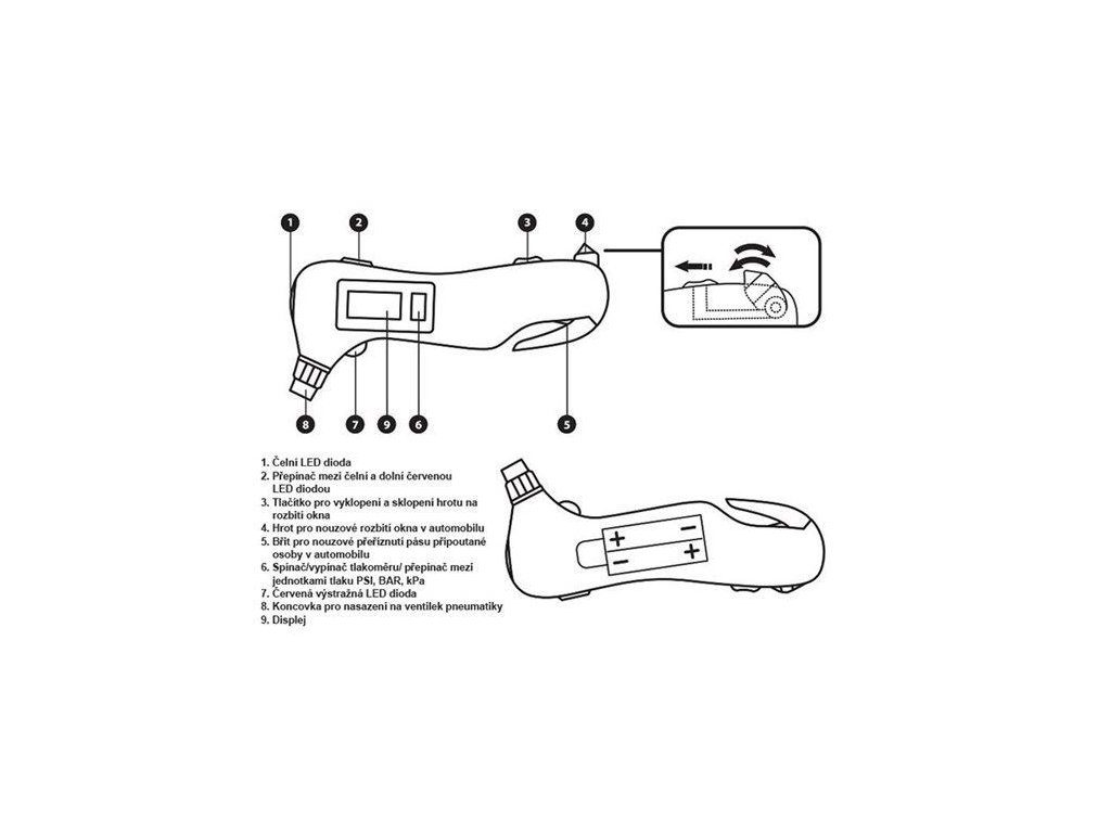 Pneuměřič digitální EMERGENCY 5 v 1, 5 funkcí, EXTOL PREMIUM, 8863050 5 funkcí: , pneuměřič 3-150PSI (jednotky psi, bar, kPa), LED světlo bílé, LED světlo výstražné červené, nůž na bezpečnostní pásy, kladívko na sklo, baterie 2x1,5V typ AAA (nejsou součástí balení), LCD displej s podsvícenímManuál k produktu je ke stažení zde
