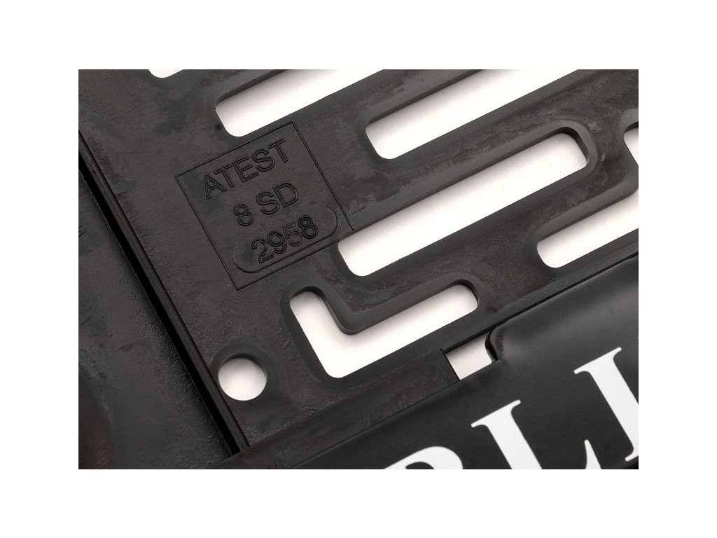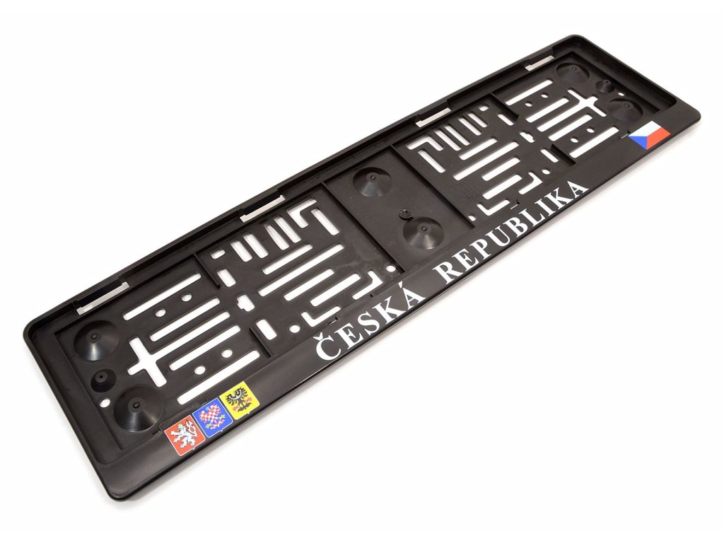 Plastová podložka pod registrační značku vozidla (státní poznávací značku), otvory pro univerzální montáž. S erby a s nápisem Česká republika.