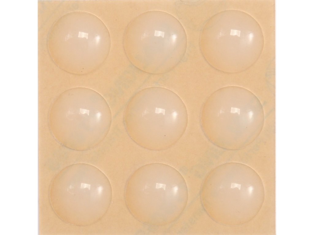 Sada gumových dorazů vhodných jako tlumení dorazu zavírání skleněných dvířek či jako malé protiskluzové nožičky pro skleněné desky a jiné průhledné předměty.