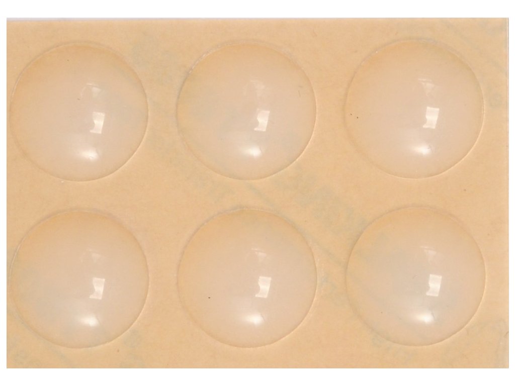 Sada gumových dorazů vhodných jako tlumení dorazu zavírání skleněných dvířek či jako malé protiskluzové nožičky pro skleněné desky a jiné průhledné předměty.