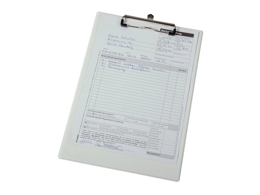 Podložky pro psaní dokumentů až do formátu A4, extra silná deska, s poniklovanou sponou a se sklopným závěsným očkem, v různých barvách.