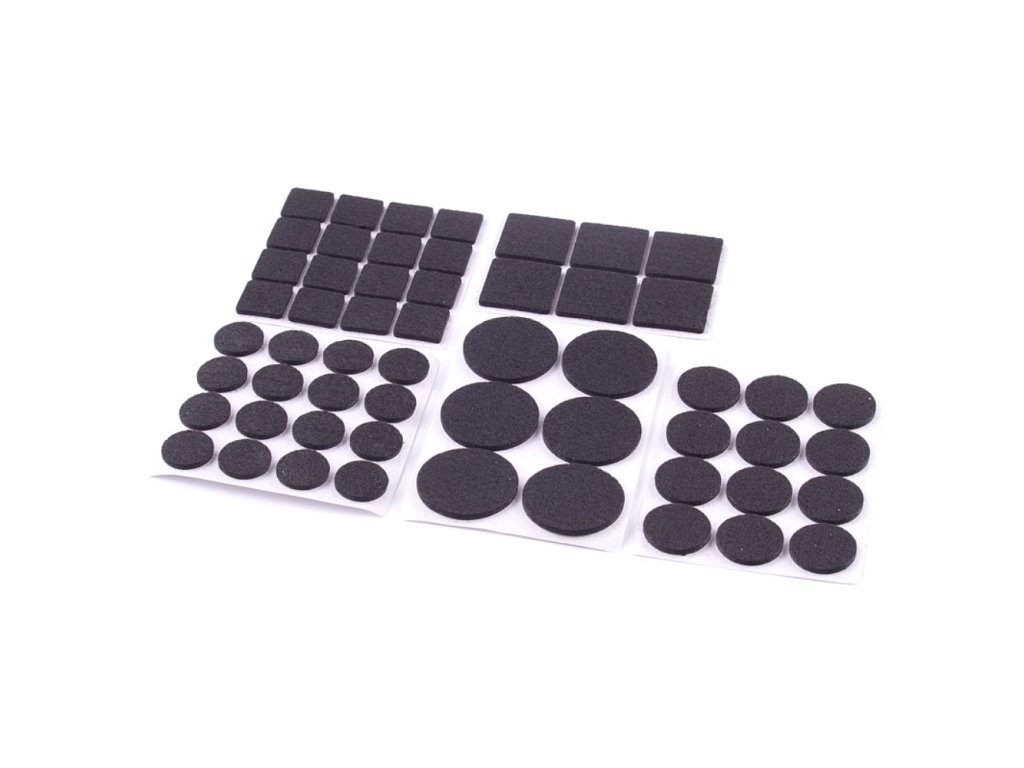 POPISPodložky filcové černé, sada 56 ksKulaté :16 x 20, 12 x 25, 6 x 38 mmČtvercové :16 x 20, 6 x 30 mmTloušťka 3 mmSamolepící