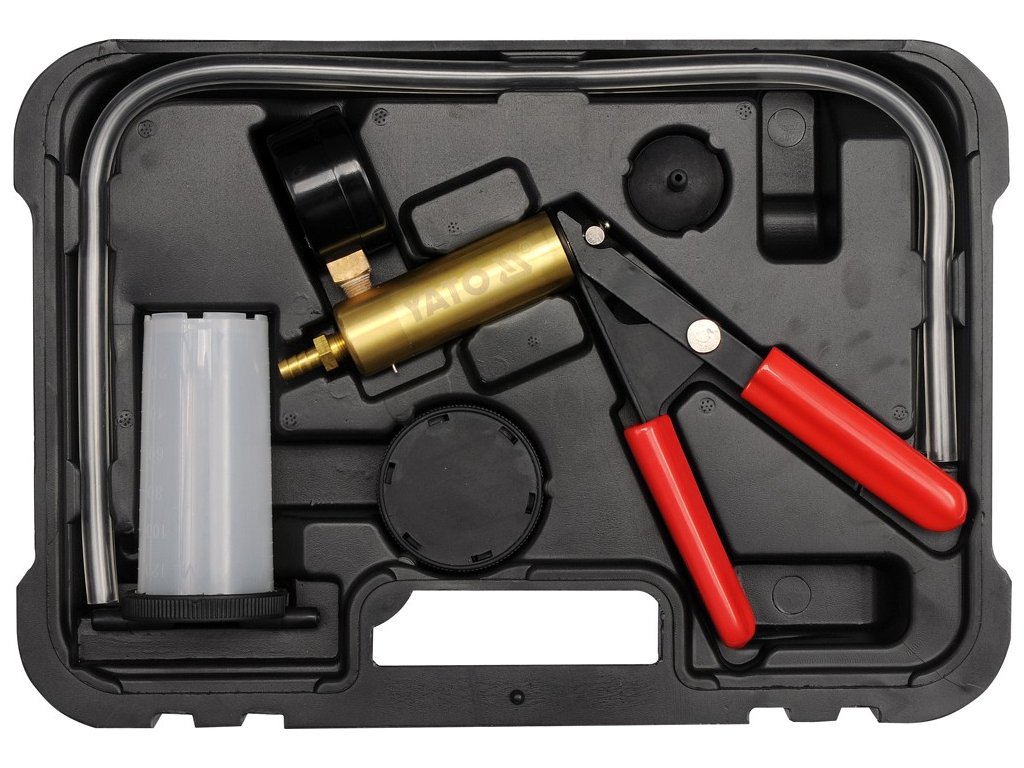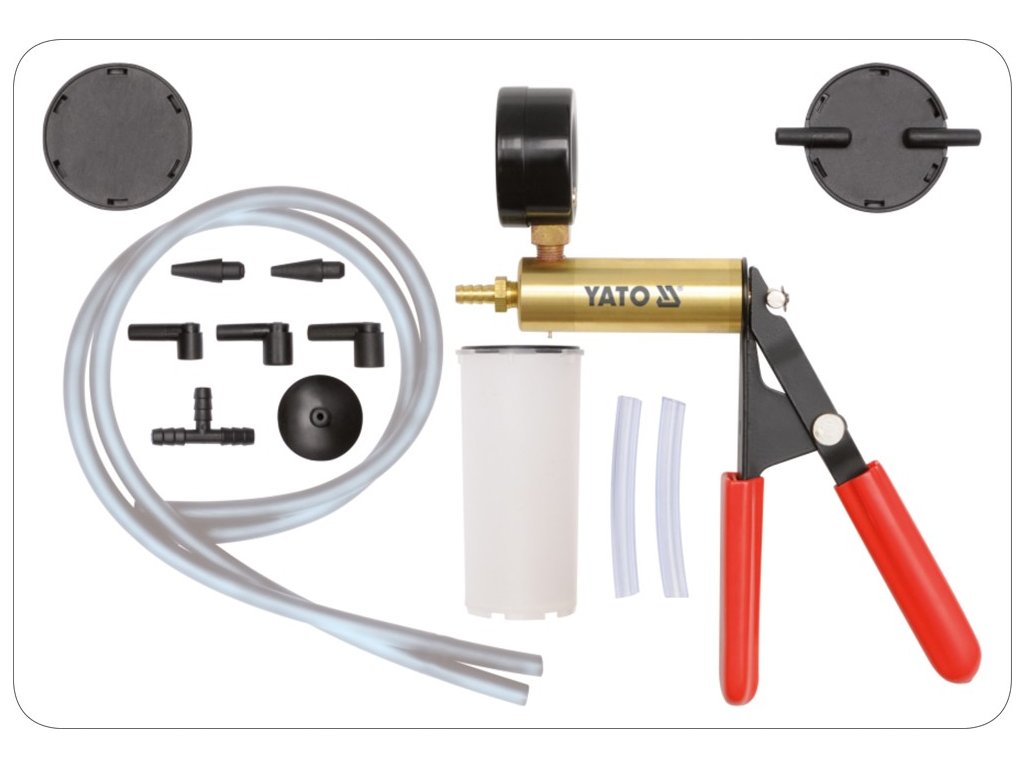 V sadě se nachází 16 ks dílů, a to ruční čerpadlo s manometrem, pracující s podtlakem až -1 bar, nádobka na kapaliny, hadičky a další propojovací prvky.