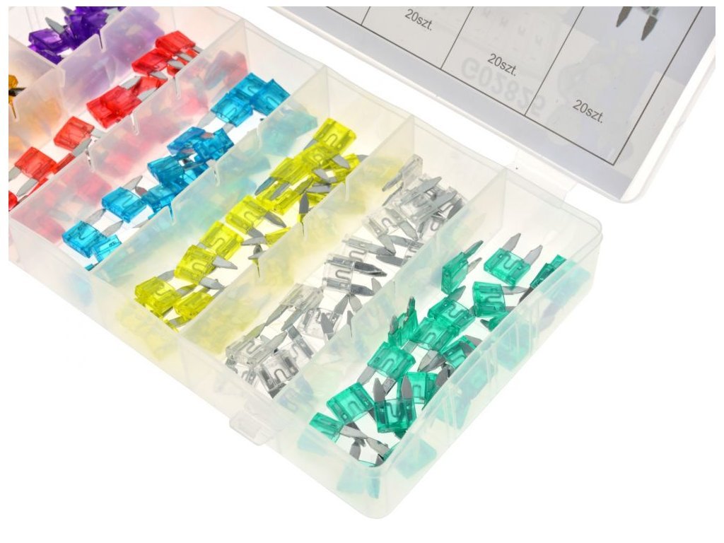 Sada 140 ks automobilových pojistek mini. Sedm typů pojistek v rozsahu od 3 do 30 A. Plastový organizér s praktickými přihrádkami.