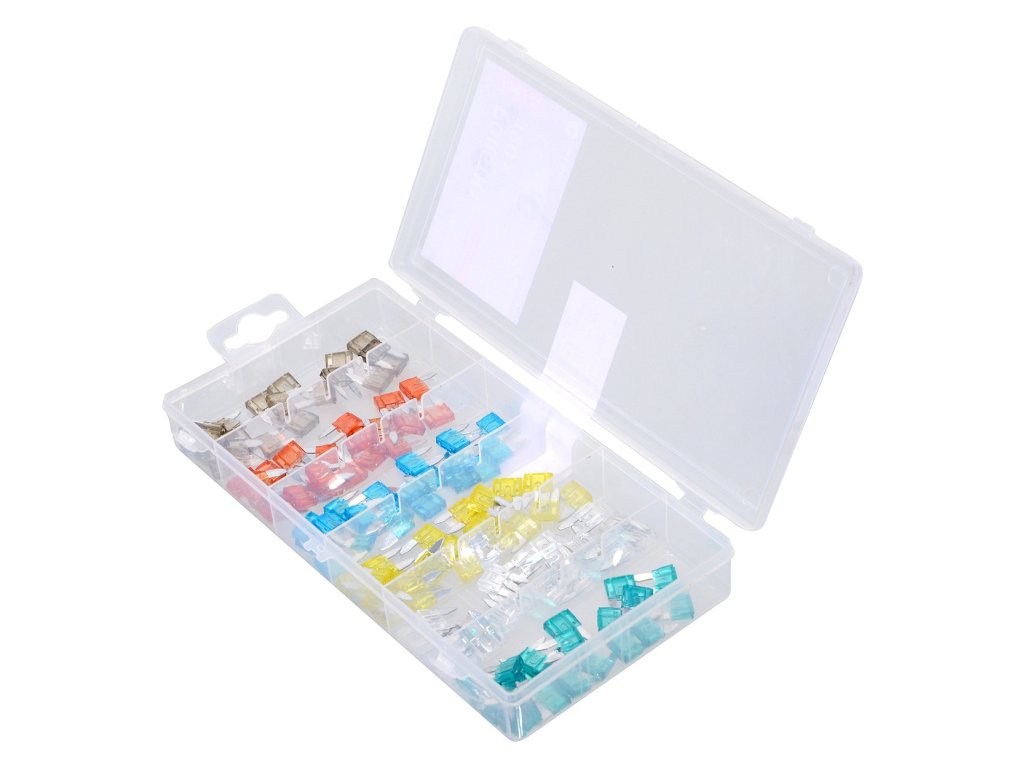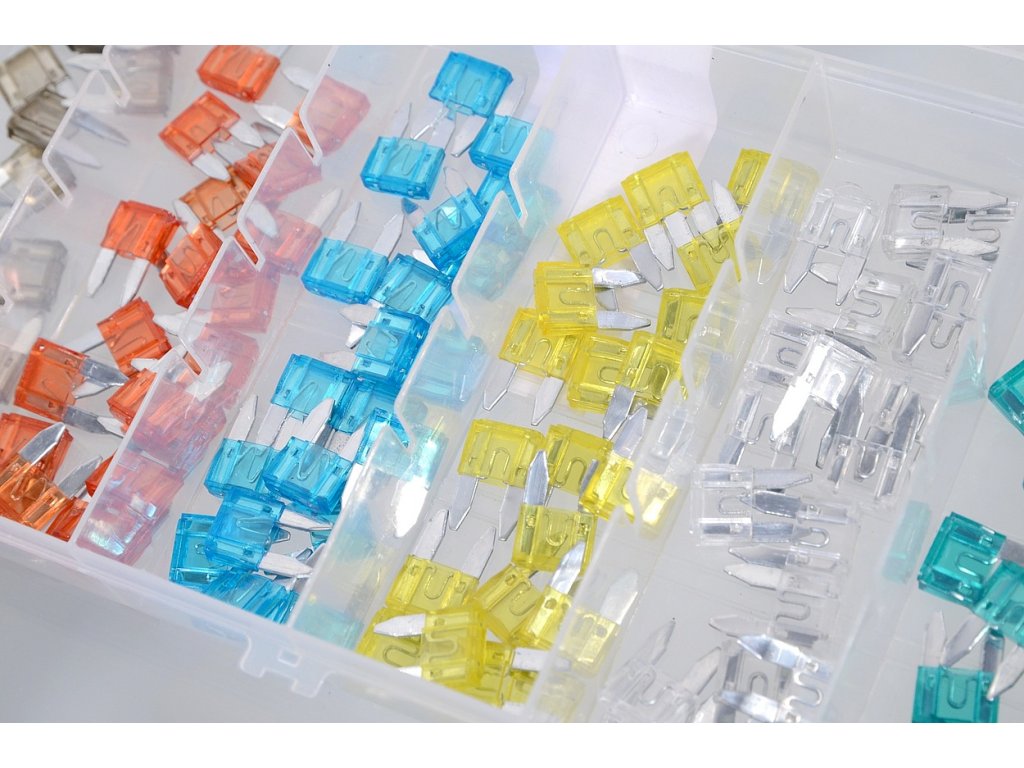 Celkem 120 pojistek v přehledném, přihrádkami opatřeném kufříku. Pojistky jsou určeny pro napětí do 50 V a jsou certifikovány, materiál zinek v kombinaci s plastem.