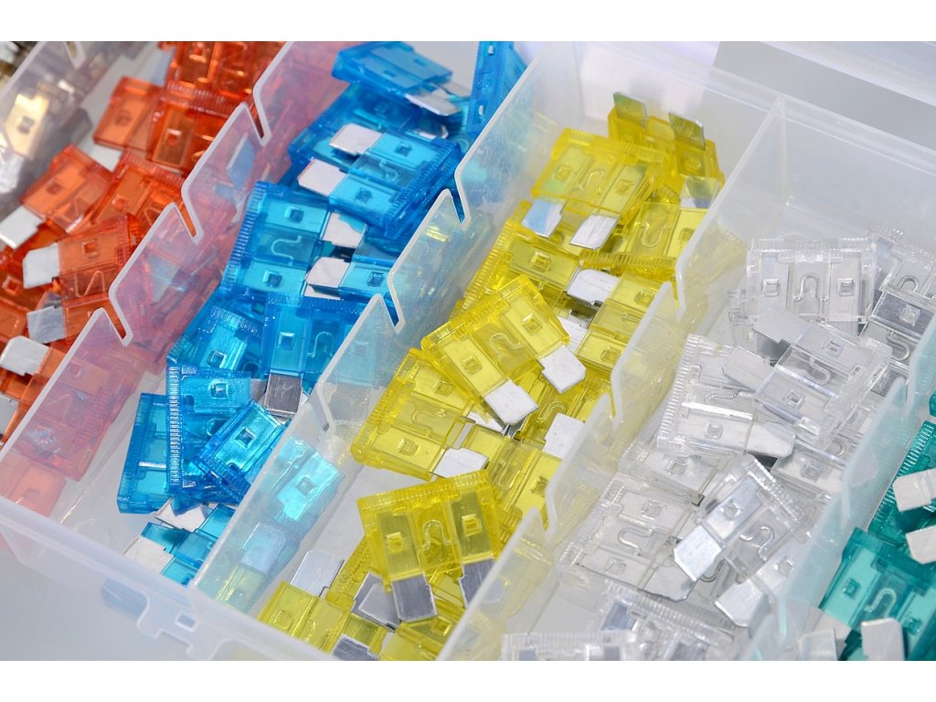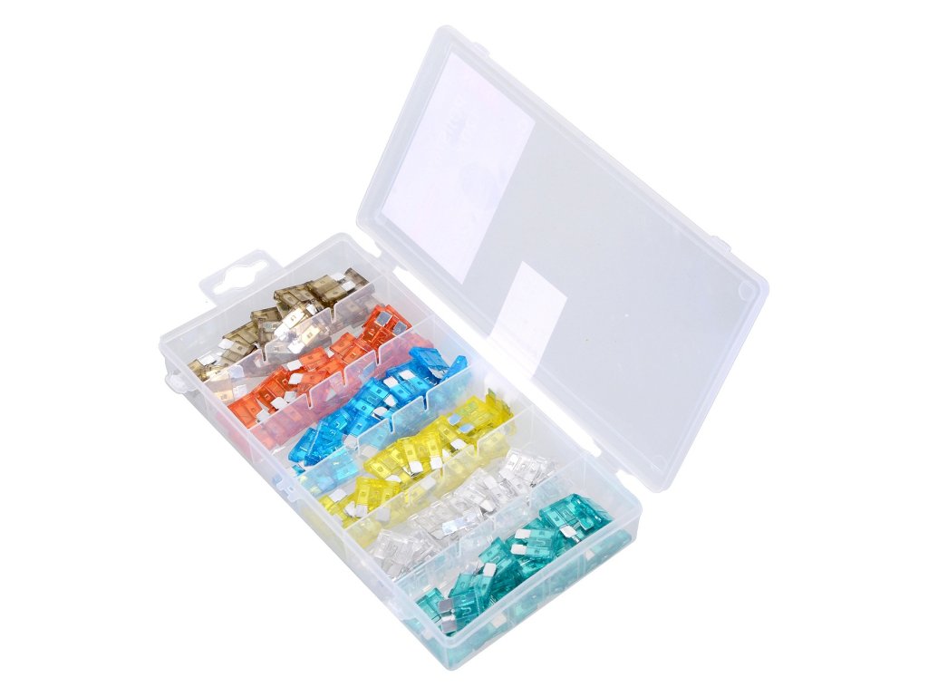 Celkem 120 pojistek v přehledném, přihrádkami opatřeném kufříku. Pojistky jsou určeny pro napětí do 50 V a jsou certifikovány, materiál zinek v kombinaci s plastem.