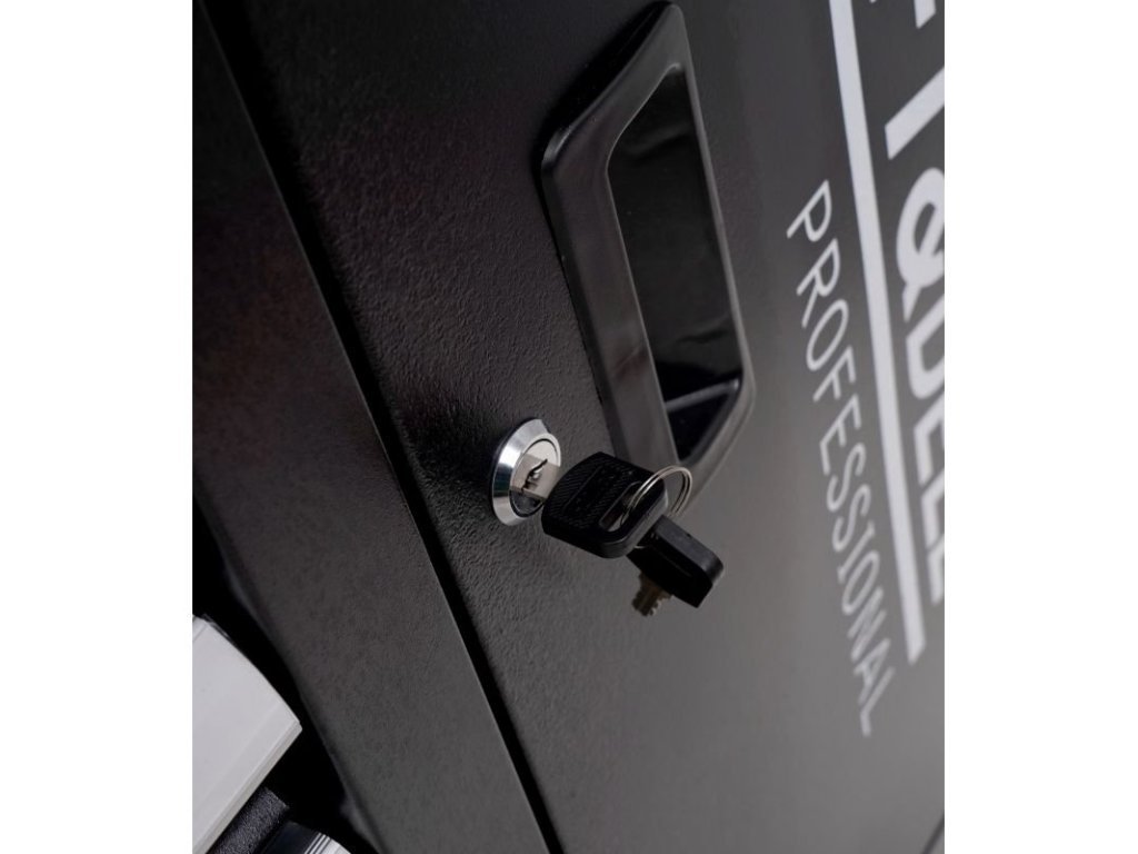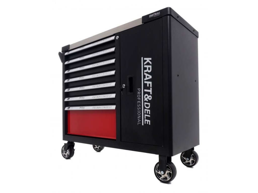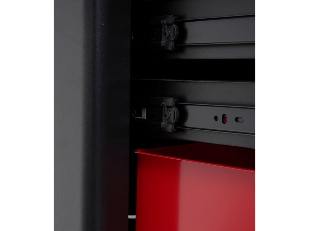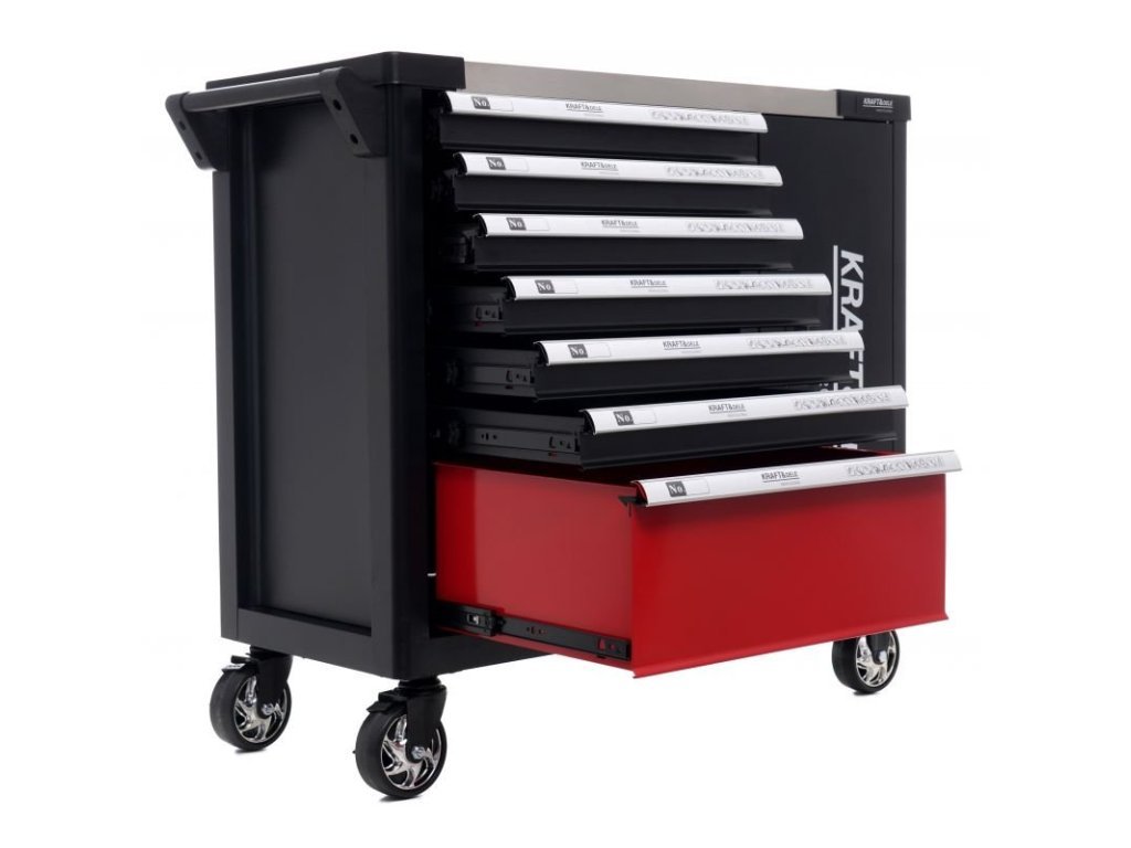 Pomáhá udržovat pořádek na pracovišti a chrání vaše nářadí před krádeží (vozík je uzamčen klíčem). Skříň má ergonomickou rukojeť integrovanou s boční stěnou, pevně uchycenou, což usnadňuje přepravu. Plně výsuvné zásuvky na ložiskách. Každá zásuvka má zabezpečení proti náhodnému otevření a je zamykatelná na klíč. Zásuvky jsou umístěné na ložiskových kolejnicích, což zajišťuje jejich hladké, tiché a dlouhodobé otevírání. Všechny klíče jsou vyrobeny z chrom-vanadiové oceli (CrV).