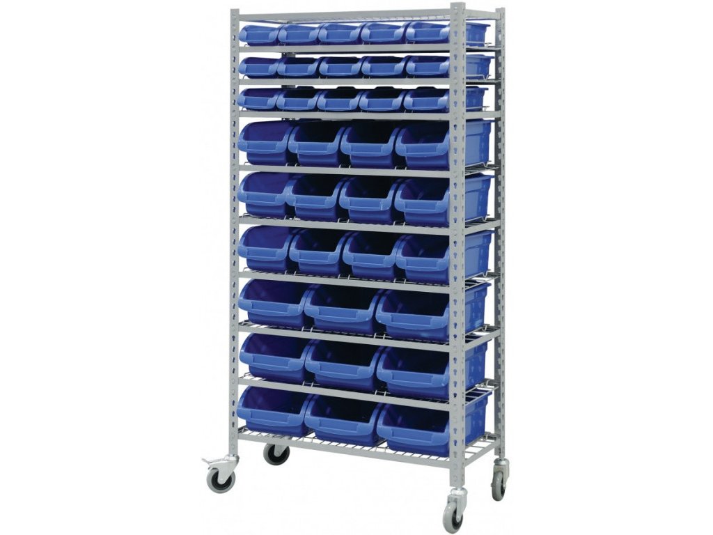 Kovový regál je osazen 10 ks pozinkovanými drátěnými policemi s vodícími kolejnicemi pro plastové boxy a stropem ve stejném provedení. Samotné skladové nádoby jsou z odolného plastu pro dlouhou životnost a jsou uzpůsobeny pro snadné vkládání a odebírání obsahu.