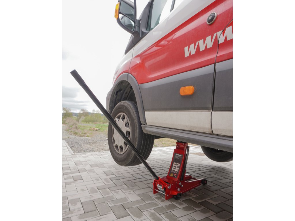Zvedák má nosnost 2,5 t a lze použít při zvedání osobních i menších dodávkových automobilů.