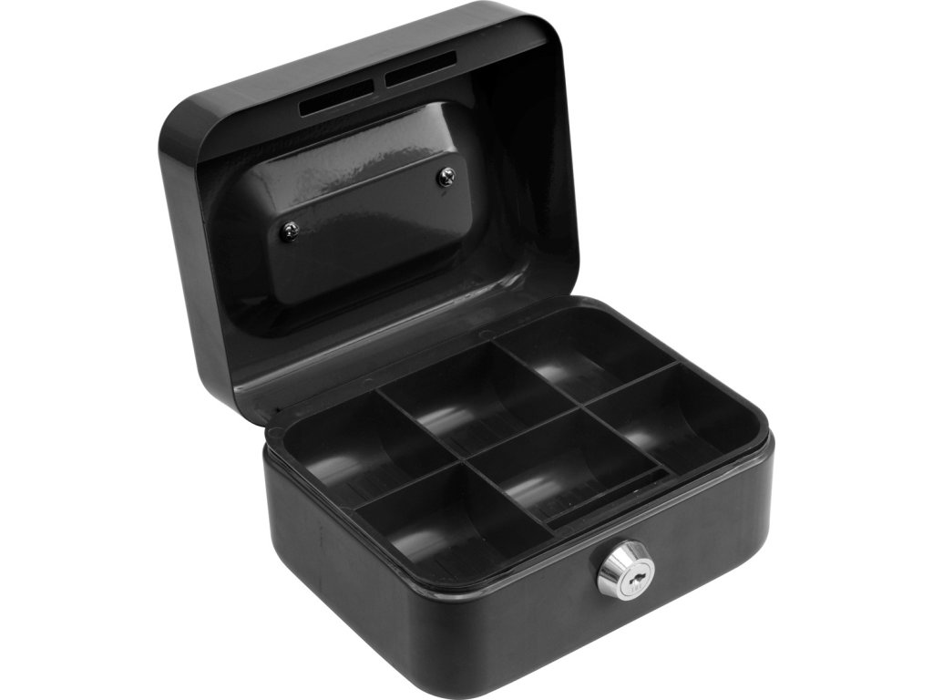 Přenosná pokladna o rozměrech 150x120x80mm. Vyrobeno z ocelového plechu o tloušťce 0,7 mm, černě natřeno. Zamykání na klíč. Sada obsahuje 2 klíče. Odnímatelná plastová vložka na mince uvnitř.
