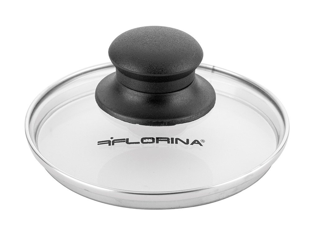 Skleněná poklice s plastovým úchytem a kovovým orámováním průměru 14 cm.