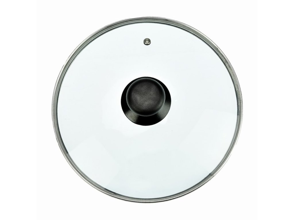 Skleněná poklice s plastovým úchytem a kovovým orámováním průměru 30 cm.