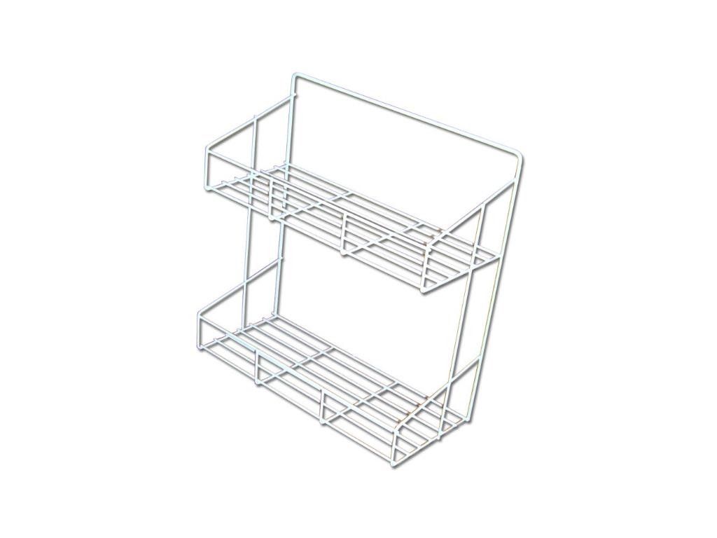 Dvoupatrová koupelnová police vyrobená z drátu s bílým poplastováním.Rozměry 35 x 34.5 x 14 cm, výška mezi policemi 17.5 cm.