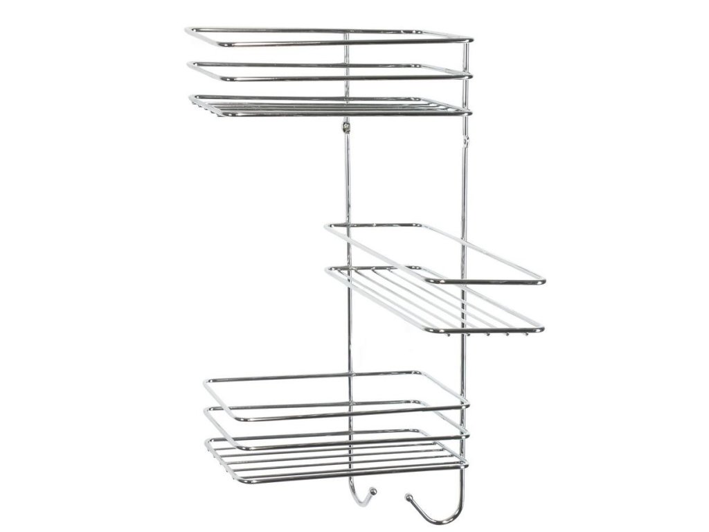 Kvalitní rohová třípatrová koupelnová polička vyrobená z chromovaného drátu.Polička je vybavena háčky na zavěšní houbičky, žínky apod.