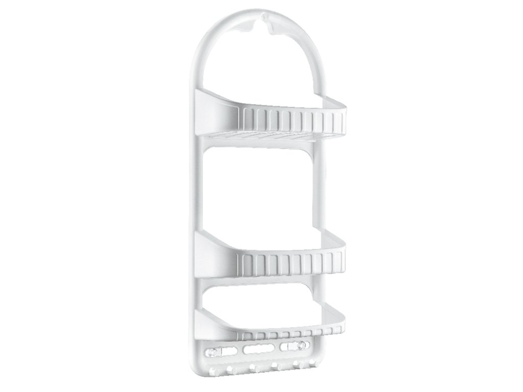 Třípatrová plastová police s háčky na zavěšení, určena k montáži na stěnu.Rozměry 27 x 12 x 62 cm (Š x H x V).