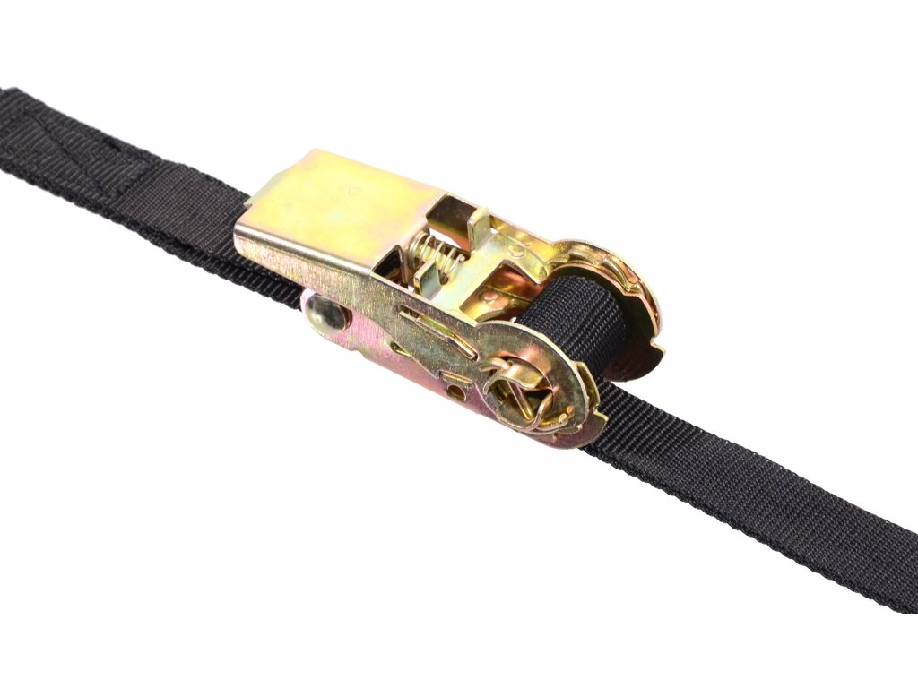 Pro upnutí se využívá celokovová ráčna s jisticím mechanizmem a háky na koncích popruhů.