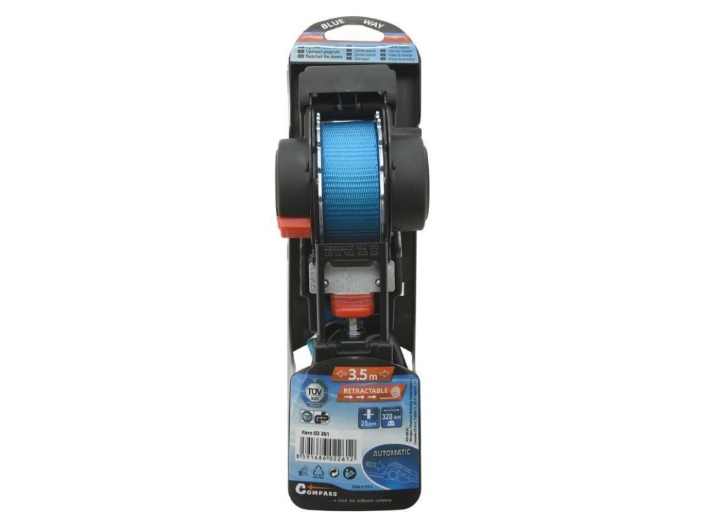 Popruh s ráčnou a háky samonavíjecí 320daN 3,5m TÜV BLUE WAY COMPASS
