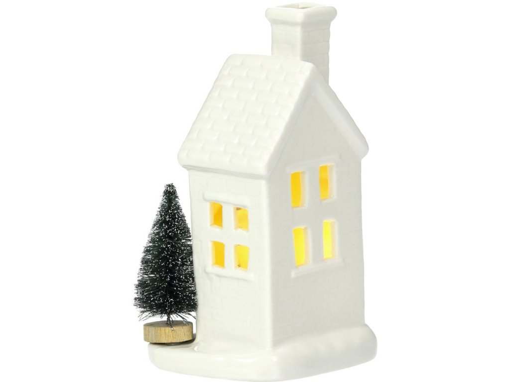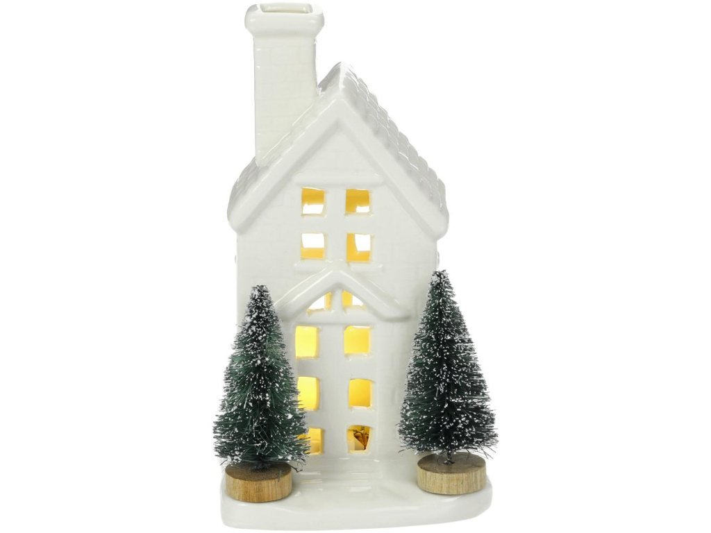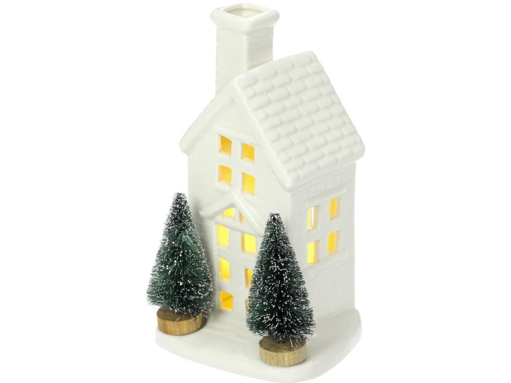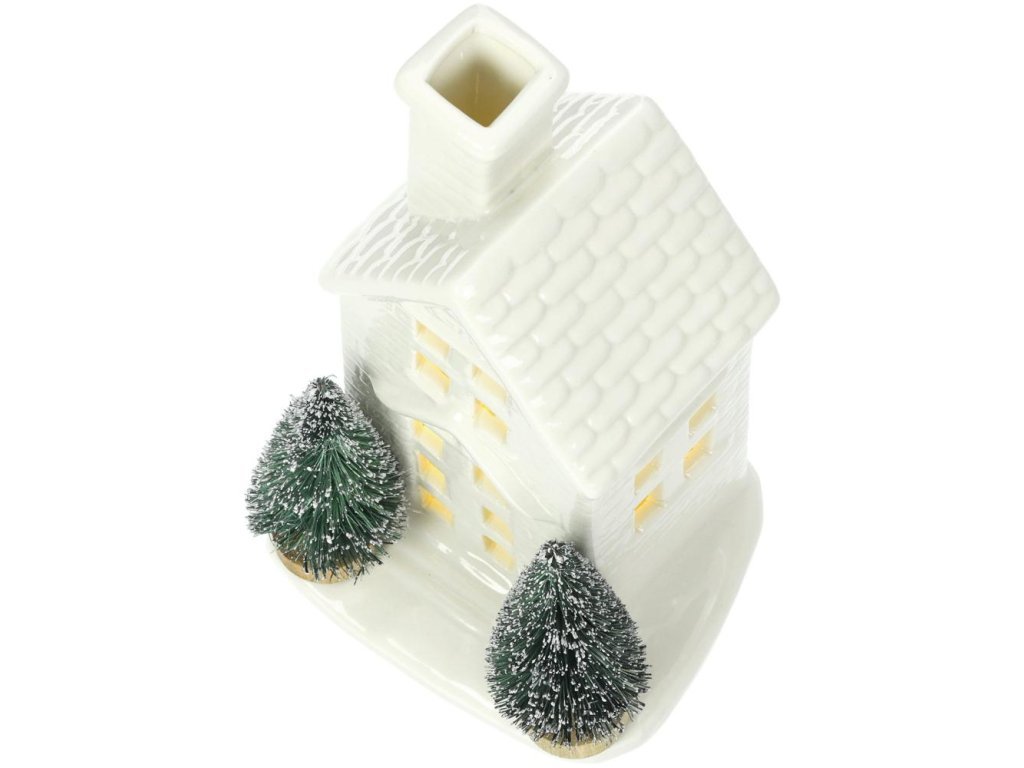 Detailně zpracovaná dekorace z bílého porcelánu s motivem zasněžených stromečků kolem domku evokuje idylickou zimní krajinu. Světlo LED diody jemně prosvítá okny domku a vytváří příjemnou atmosféru.