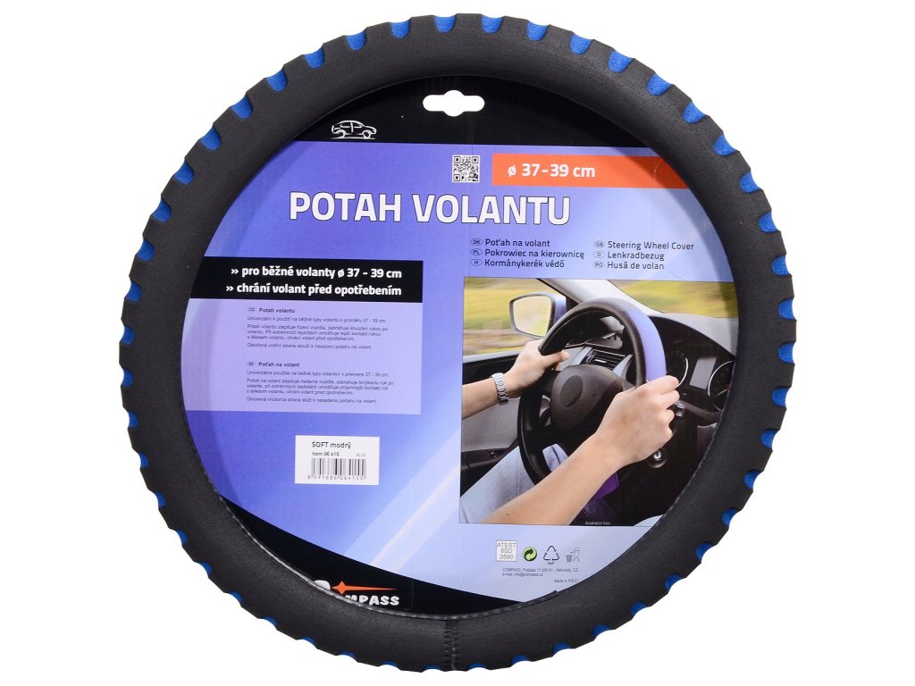 Pěnový potah určený k nasazení na volant o průměru 37-39cm. Příjemný do ruky. Barva černá s modrými prolisy.