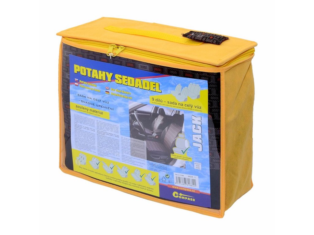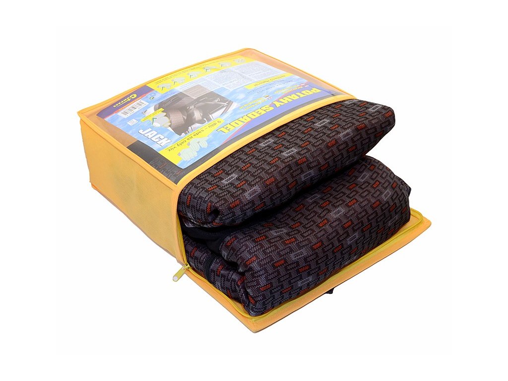Potahy sedadel "JACK", sada na celý vůz. Potah je vyroben ze zpevněného podšitého materiálu v celé ploše, lze připevnit na většinu běžně používaných automobilových sedadel. Potah lze použít na sedadlech, která mají zabudovaný boční airbag přímo v opěradle předních sedadel. Balení obsahuje potah na přední sedadlo (2x), zadní sedák (celý), zadní opěradlo (pomocí zipu dělitelné na 3 díly), opěrku hlavy (5x). Díky zipům na zadní opěradlová části je možné potahy použít i na vozy s dělenými zadními sedadly a opěradla sklápět bez nutnosti sejmutí potahu.