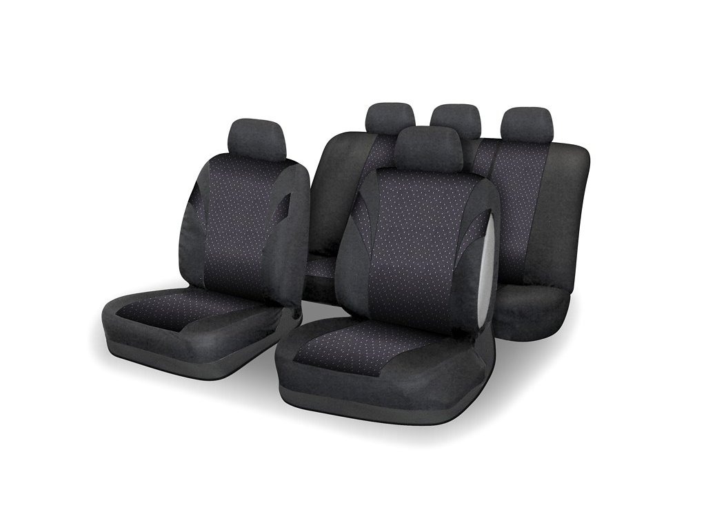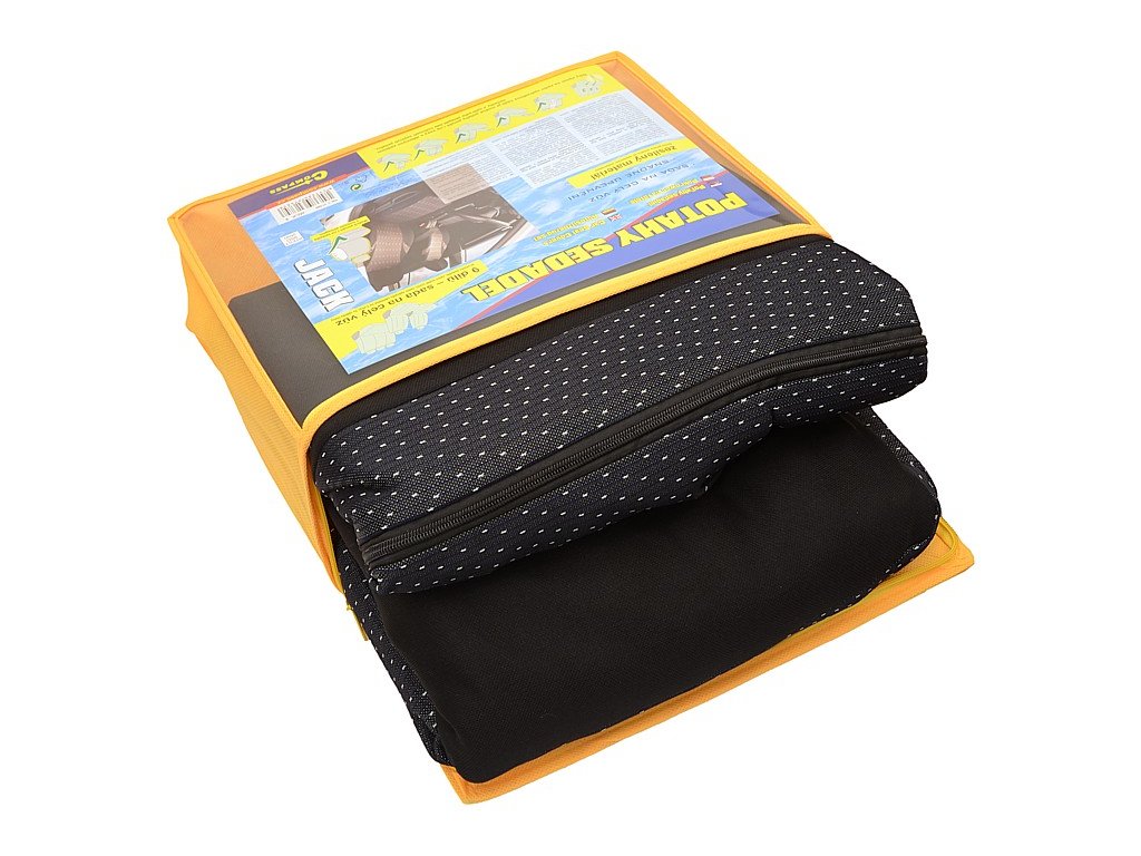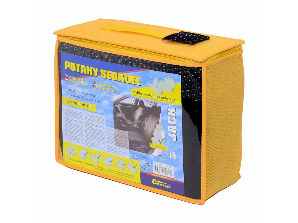 Potahy sedadel "JACK", sada na celý vůz. Potah je vyroben ze zpevněného podšitého materiálu v celé ploše, lze připevnit na většinu běžně používaných automobilových sedadel. Potah lze použít na sedadlech, která mají zabudovaný boční airbag přímo v opěradle předních sedadel. Balení obsahuje potah na přední sedadlo (2x), zadní sedák (celý), zadní opěradlo (pomocí zipu dělitelné na 3 díly), opěrku hlavy (5x). Díky zipům na zadní opěradlová části je možné potahy použít i na vozy s dělenými zadními sedadly a opěradla sklápět bez nutnosti sejmutí potahu.