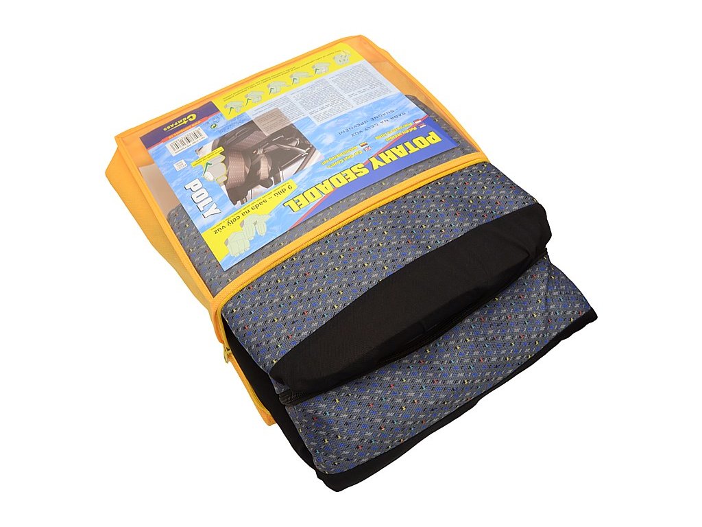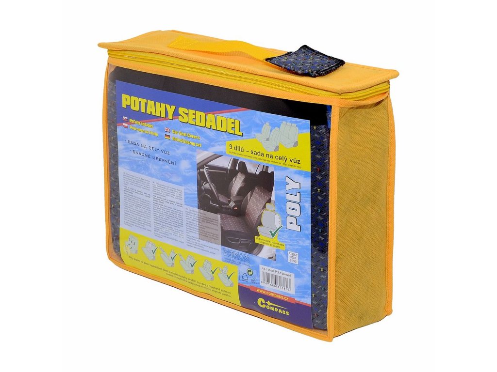 Potahy sedadel "POLY", sada na celý vůz. Lze připevnit na většinu běžně používaných automobilových sedadel. Potah lze použít na sedadlech, která mají zabudovaný boční airbag přímo v opěradle předních sedadel. Balení obsahuje potah na přední sedadlo (2x), zadní sedák (celý), zadní opěradlo (pomocí zipu dělitelné na 3 díly), opěrku hlavy (5x). Díky zipům na zadní opěradlové části je možné potahy použít i na vozy s dělenými zadními sedadly a opěradla sklápět bez nutnosti sejmutí potahu.