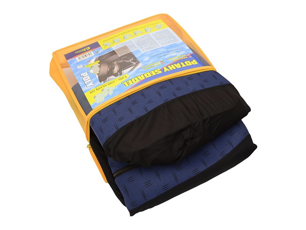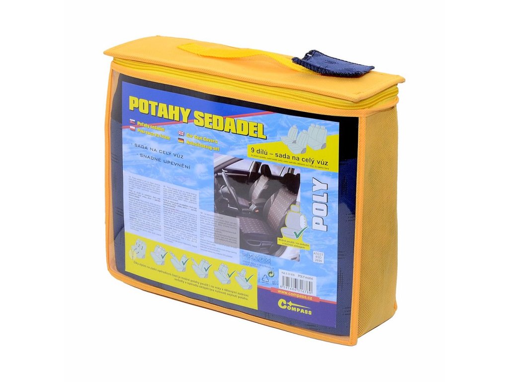 Potahy sedadel "POLY", sada na celý vůz. Lze připevnit na většinu běžně používaných automobilových sedadel. Potah lze použít na sedadlech, která mají zabudovaný boční airbag přímo v opěradle předních sedadel. Balení obsahuje potah na přední sedadlo (2x), zadní sedák (celý), zadní opěradlo (pomocí zipu dělitelné na 3 díly), opěrku hlavy (5x). Díky zipům na zadní opěradlové části je možné potahy použít i na vozy s dělenými zadními sedadly a opěradla sklápět bez nutnosti sejmutí potahu.