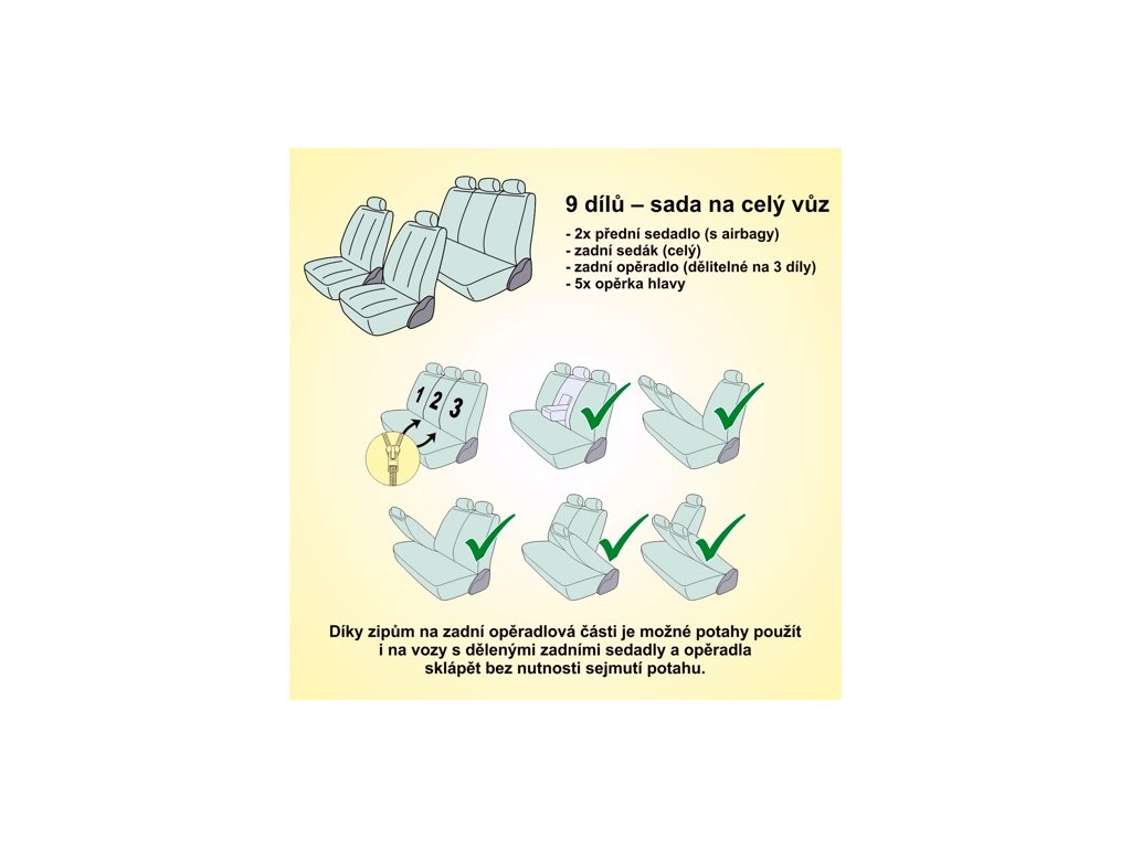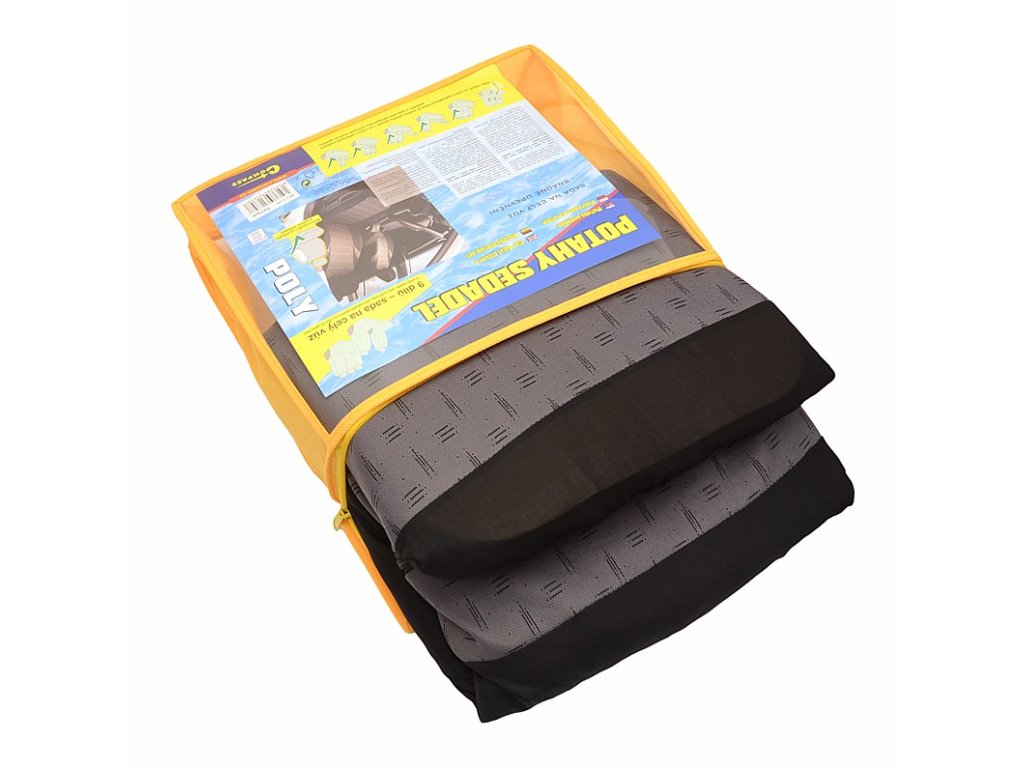 Potahy sedadel "POLY", sada na celý vůz. Lze připevnit na většinu běžně používaných automobilových sedadel. Potah lze použít na sedadlech, která mají zabudovaný boční airbag přímo v opěradle předních sedadel. Balení obsahuje potah na přední sedadlo (2x), zadní sedák (celý), zadní opěradlo (pomocí zipu dělitelné na 3 díly), opěrku hlavy (5x). Díky zipům na zadní opěradlové části je možné potahy použít i na vozy s dělenými zadními sedadly a opěradla sklápět bez nutnosti sejmutí potahu.