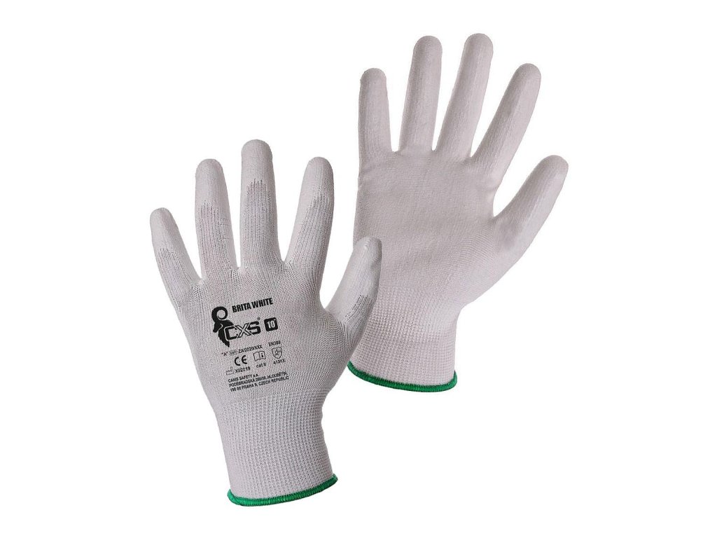 Pletené bezešvé rukavice, dlaně a prsty povrstveny polyuretanem, pružná manžeta.