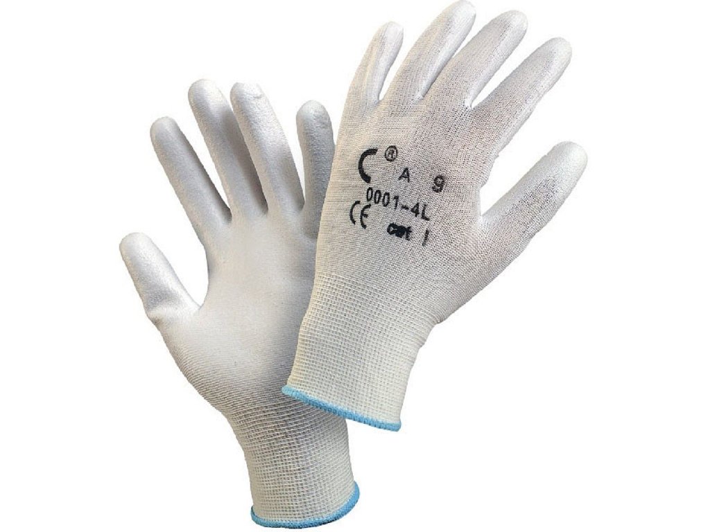 Pletené bezešvé rukavice, dlaně a prsty povrstveny polyuretanem, pružná manžeta.