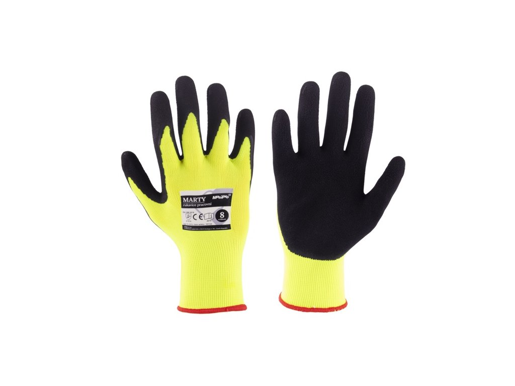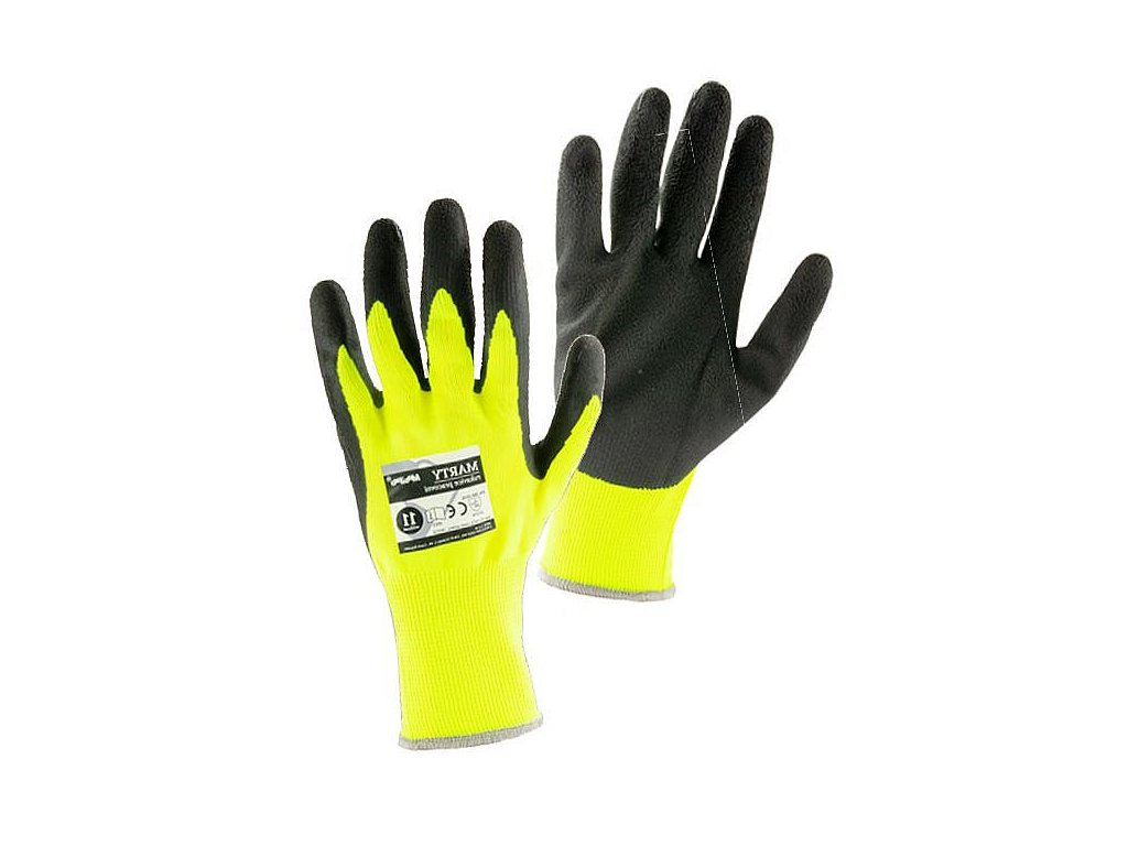 Bezešvý polyesterový úplet s pružným nápletem na zápěstí, na dlani a prstech polomáčené v latexu. Latex dobře chrání proti vlhkosti.