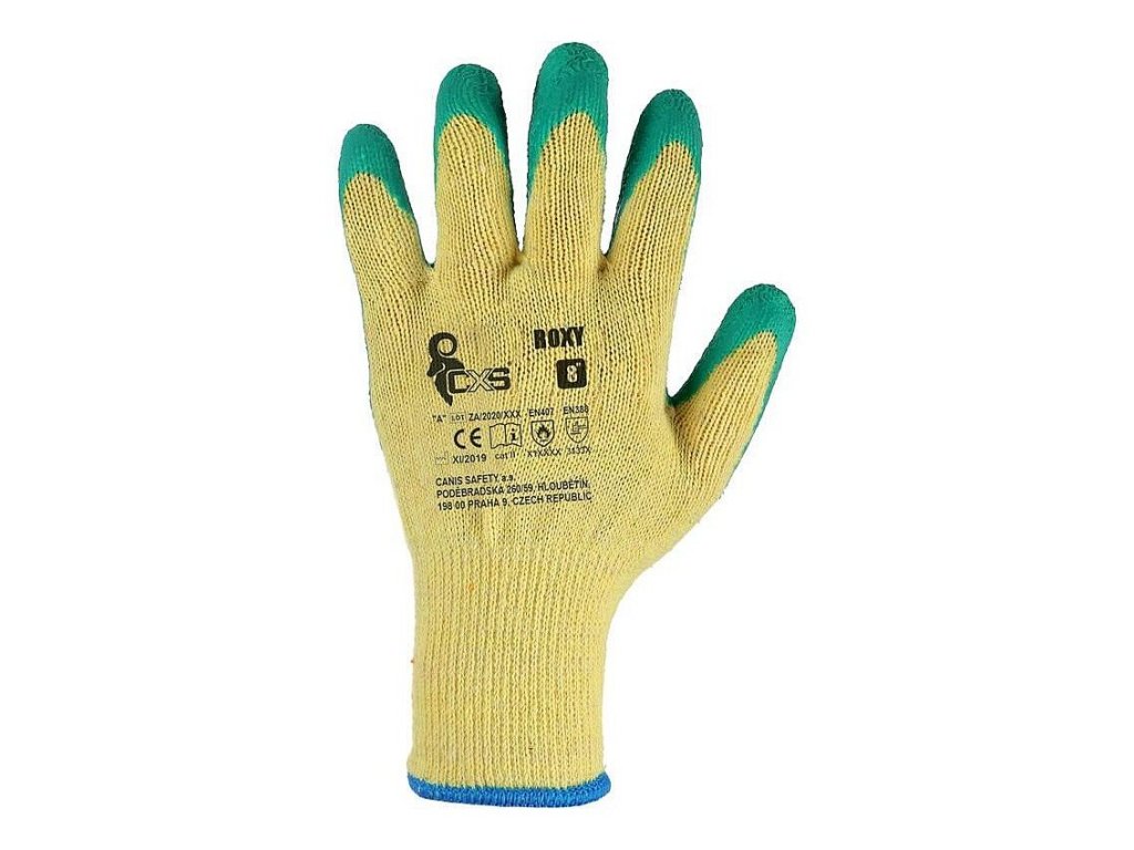 Bezešvé rukavice ze směsové pleteniny s dlaněmi a prsty povrstvenými latexem s protiskluzovým povrchem, ochrana proti kontaktnímu teplu do 100 °C.