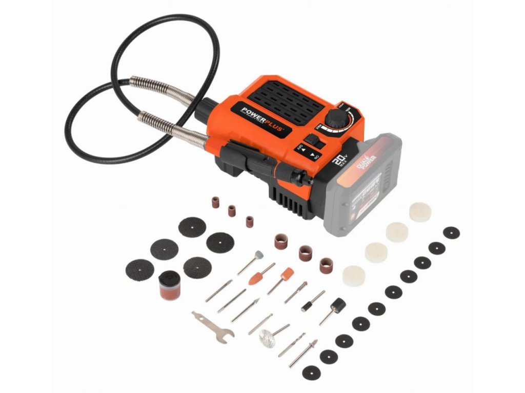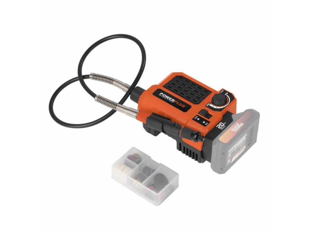 Tato akumulátorová 20 V přímá bruska POWDP75300 od PowerPlus je extrémně univerzální a se 40 doplňky si poradí i s širokou škálou kutilských projektů. V závislosti na nástavci můžete stroj použít k vrtání, frézování, leštění, řezání nebo broušení, přičemž přiložená flexibilní trubice vám poskytne potřebnou volnost pohybu. Velká všestrannost: Máte na výběr mezi 40 různými doplňky, které vám umožní spousty aktivit. Stroj je navíc vybaven elektronickou regulací otáček, takže nastavení rychlosti můžete přizpůsobit jakémukoli projektu. Přímá bruska je vybavena motorem s pozvolným rozběhem, což znamená, že se spouští pomalu, takže máte vždy plnou kontrolu a navíc má ochranu proti přetížení, které zabraňuje přehřátí stroji. Ohebná hnací hřídel Vám poskytuje potřebnou volnost pohybu, například když potřebujete pracovat v různých úhlech. Díky měkké rukojeti se stroj velmi pohodlně používá. Stroj je dodáván bez baterie a nabíječky. Použít můžete baterie ze série DUAL POWER o napětí 20V a také i baterie o napětí 40V. Použití 40V baterie zajišťuje ještě delší dobu chodu stroje ve srovnání s 20V verzí.