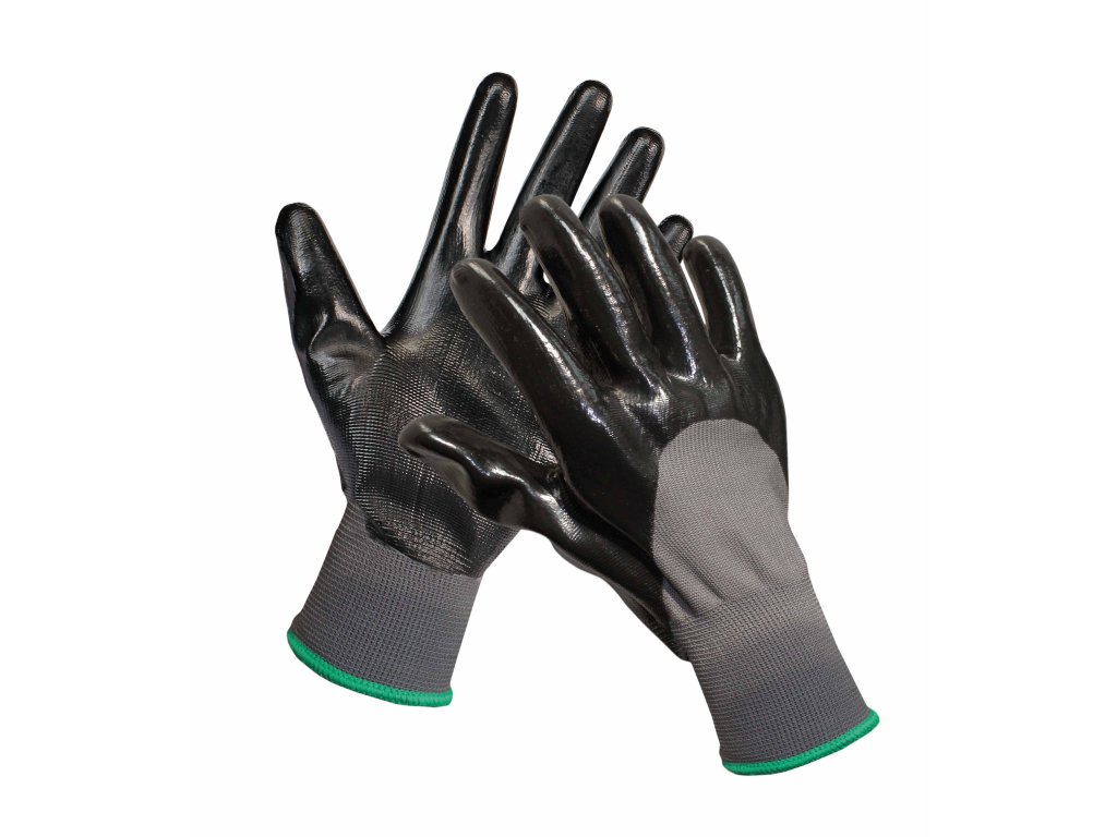 Pletené, bezešvé rukavice. Jsou máčené ze 3/4 v černém nitrilu pro ochranu dlaní a prstů. Na zápěstí je pružný náplet.