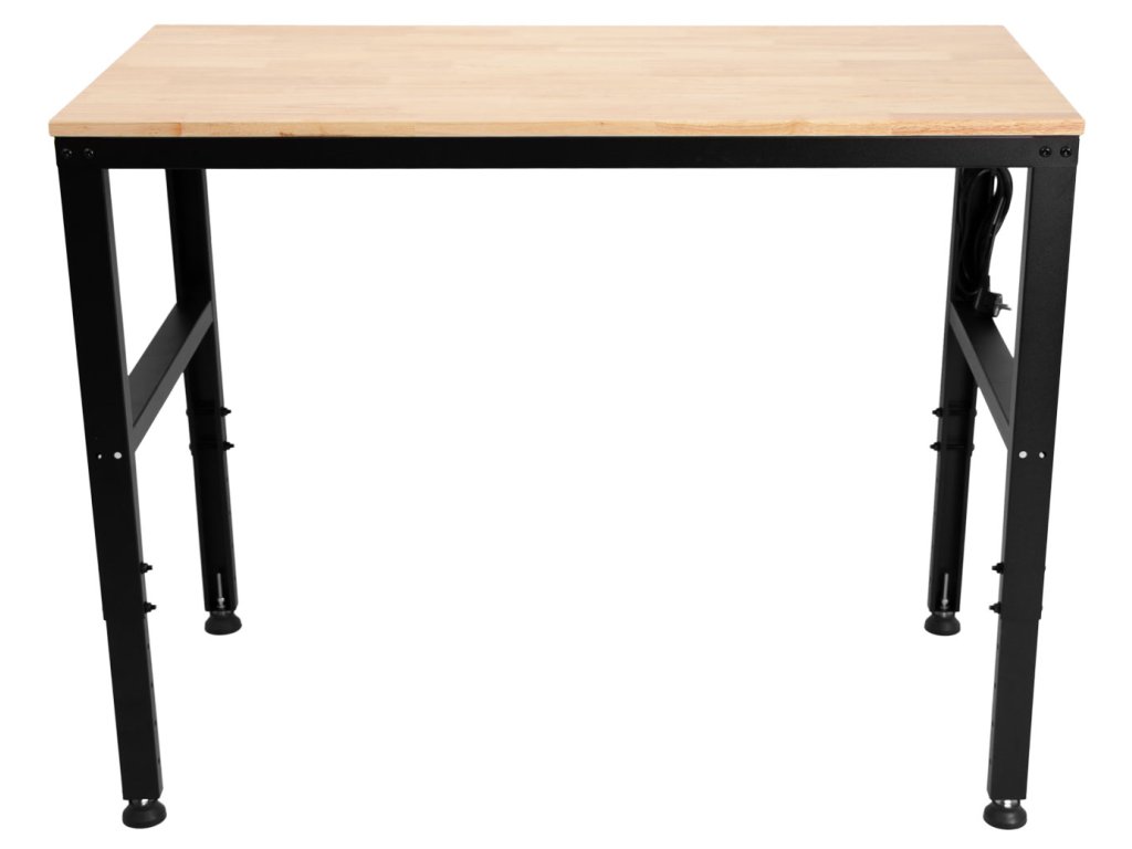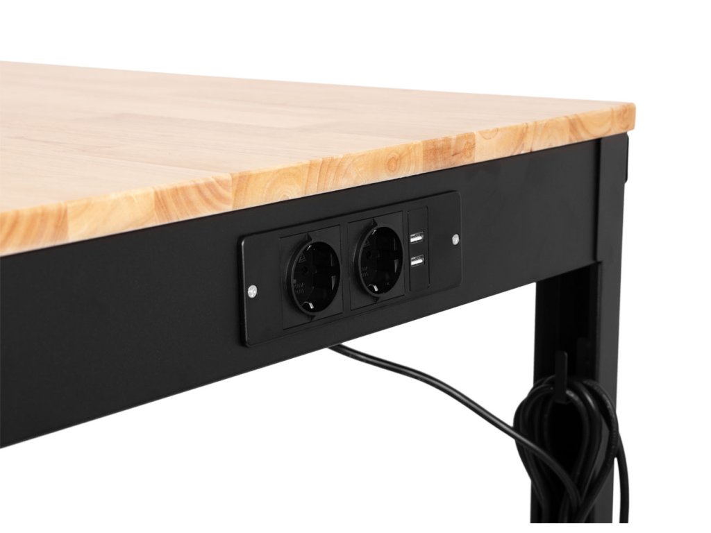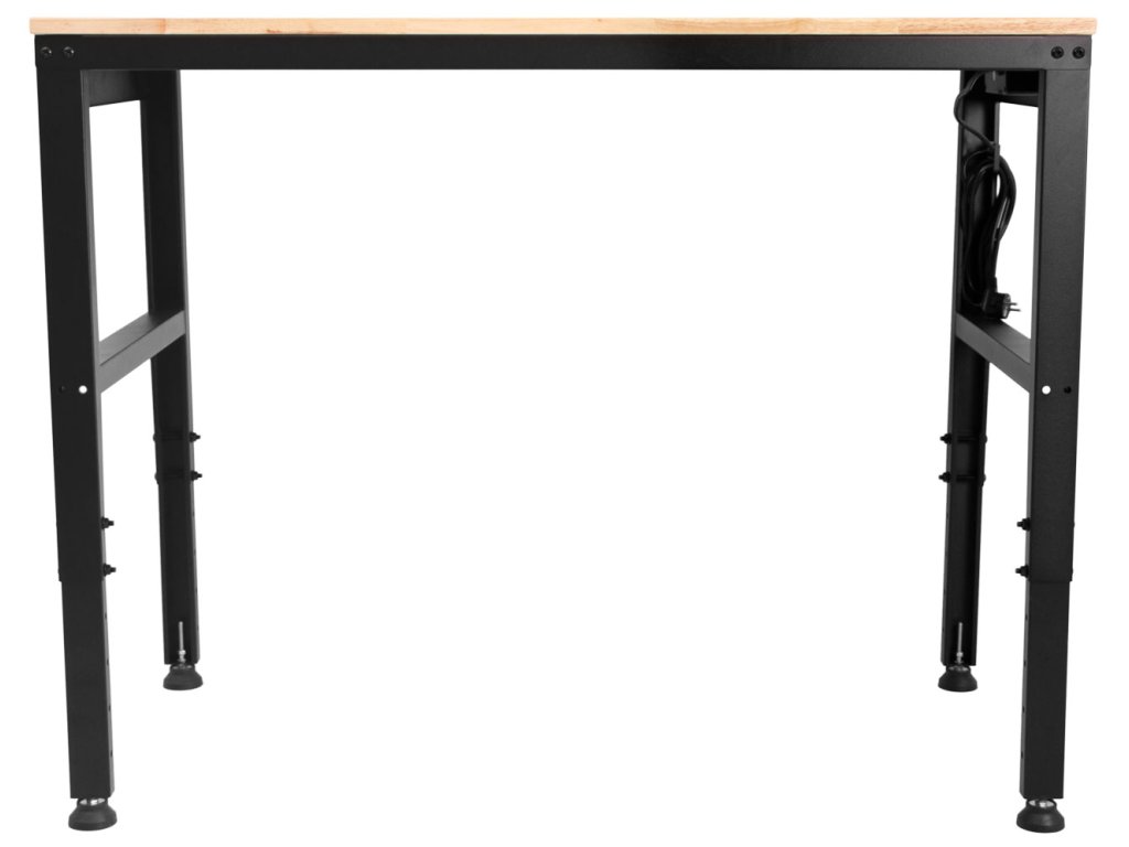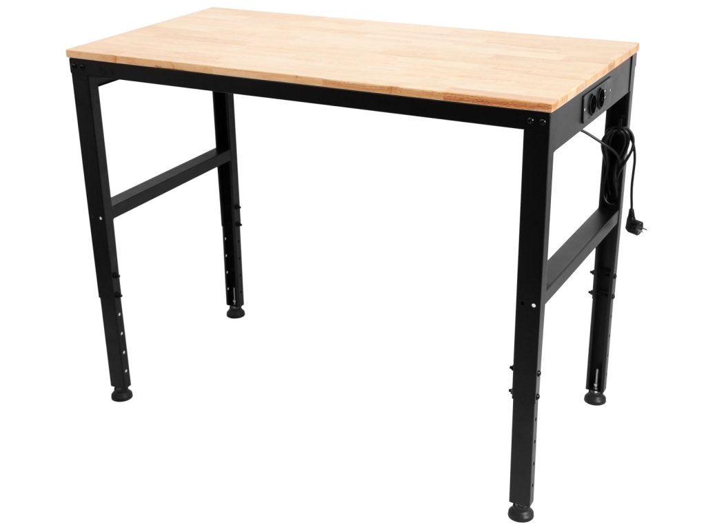 Výškově nastavitelný dílenský stůl s dřevěnou pracovní deskou a zásuvkami na 230V
