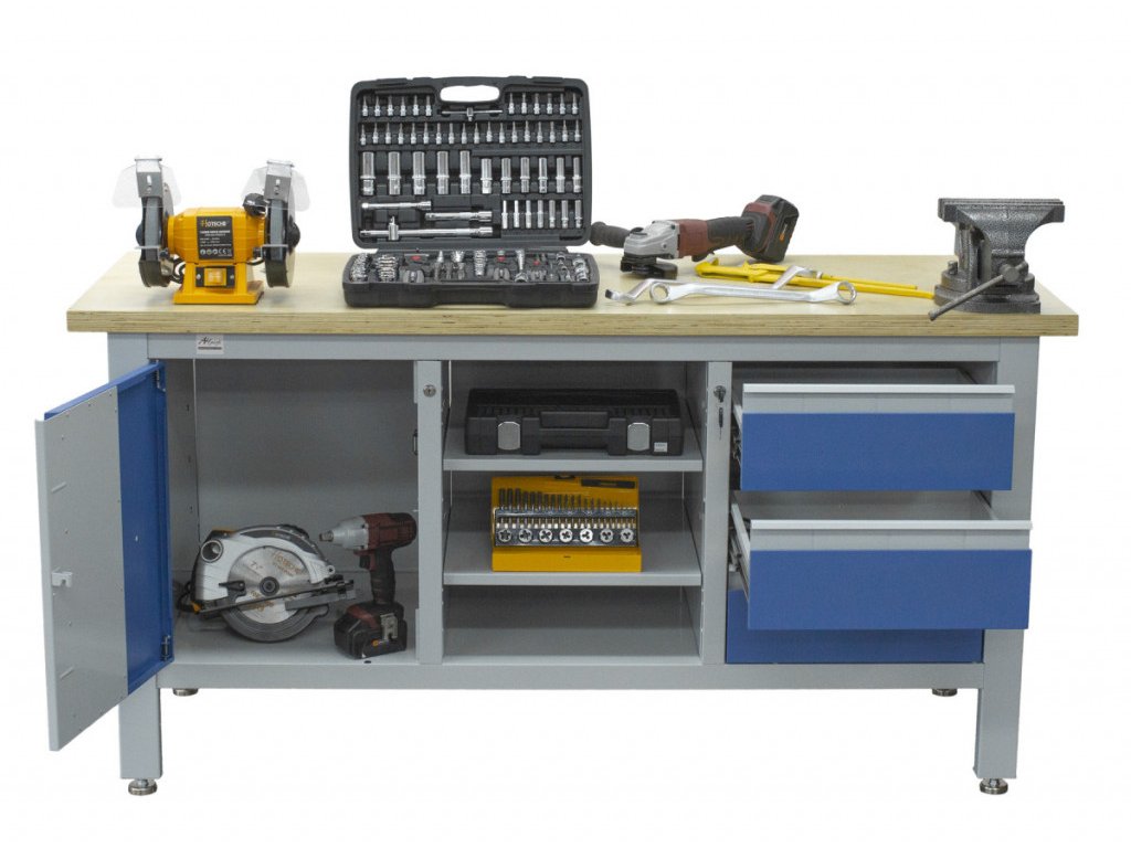 Stůl je vybavený dřevěnou pracovní deskou o rozměrech 1690 × 600 mm, uzamykatelnou skříňkou, 3 zásuvkami a 3 regály uprostřed ponku.
