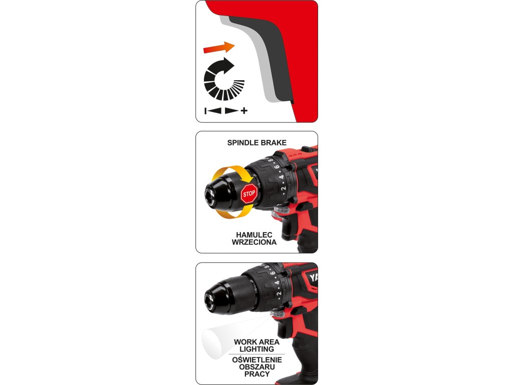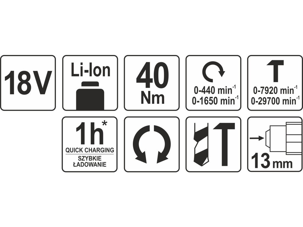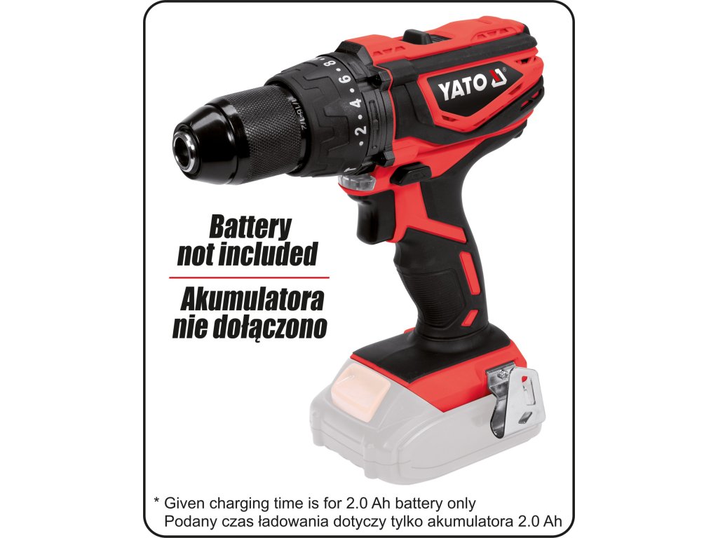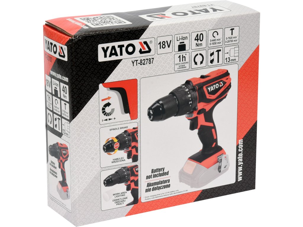 Příklepová AKU vrtačka YATO o síle 18V (max. otáček 1650 za minutu) s vysoce kvalitním pohonem.