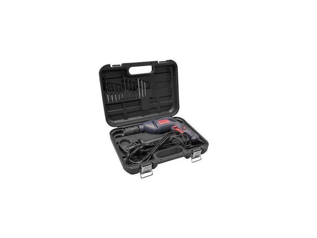 Praktická vrtačka, určená k vrtání/vrtání s příklepem v podmínkách domácností, chat, chalup apod. Funkce: vrtání (max. vrtací průměr do dřeva/oceli: 25/10 mm), vrtání s příklepem (max. vrtací průměr do betonu: 13 mm). Předvolba/řízení otáček pomocí otočného regulátoru/spínače v rukojeti (rozsah: 0 - 2.700 min.-1), pravý/levý chod (zašroubování/vyšroubování šroubů, vrutů). Motor 710 W, dvoubodový spínač s aretací stálého chodu, 3 m přípojný elektrický kabel H05VV-F. Konstrukce: rychloupínací sklíčidlo, hloubkový doraz, ergonomicky tvarovaná rukojeť s měkkou tlumicí vložkou, otočné boční držadlo. Příslušenství: vrtáky do dřeva/kovů/kamene (12-dílná sada, průměry: 3/4/5/6 - 8 mm), plastový transportní kufřík. Celkové rozměry (d x š x v): 325 x 76 x 255 mm, třída ochrany: II, druh krytí: IP 20, hladina akustického výkonu LWA: 104,7 dB (A).