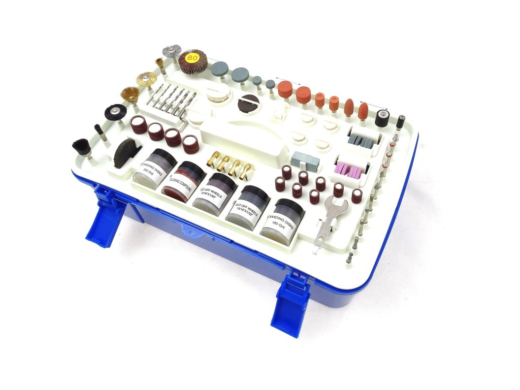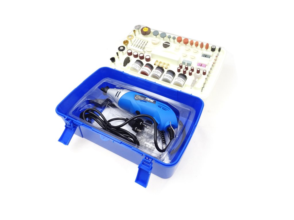 V příslušenství flexibilní prodlužovací hřídel a bohatá sada brusných a řezných nástrojů. Dodáváno v plastovém kufříku.