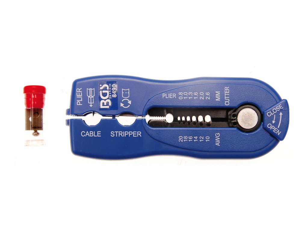 Odizolační a štípací přípravek na dráty „2 v 1“ BGS technic 8490Pro rychlé a bezpečné odizolování a štípání elektrických drátů a kablíků. Vhodné pro autoelektrikáře, elektromontéry atd.