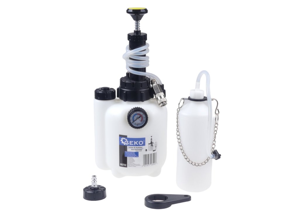 Přípravek na odvzdušnění a výměnu brzdové a spojkové kapaliny, velký zásobník 2,5 litru, malý zásobník 1 l, pracovní tlak 2 bar, univerzální adaptér 42 mm – GEKO G02732.