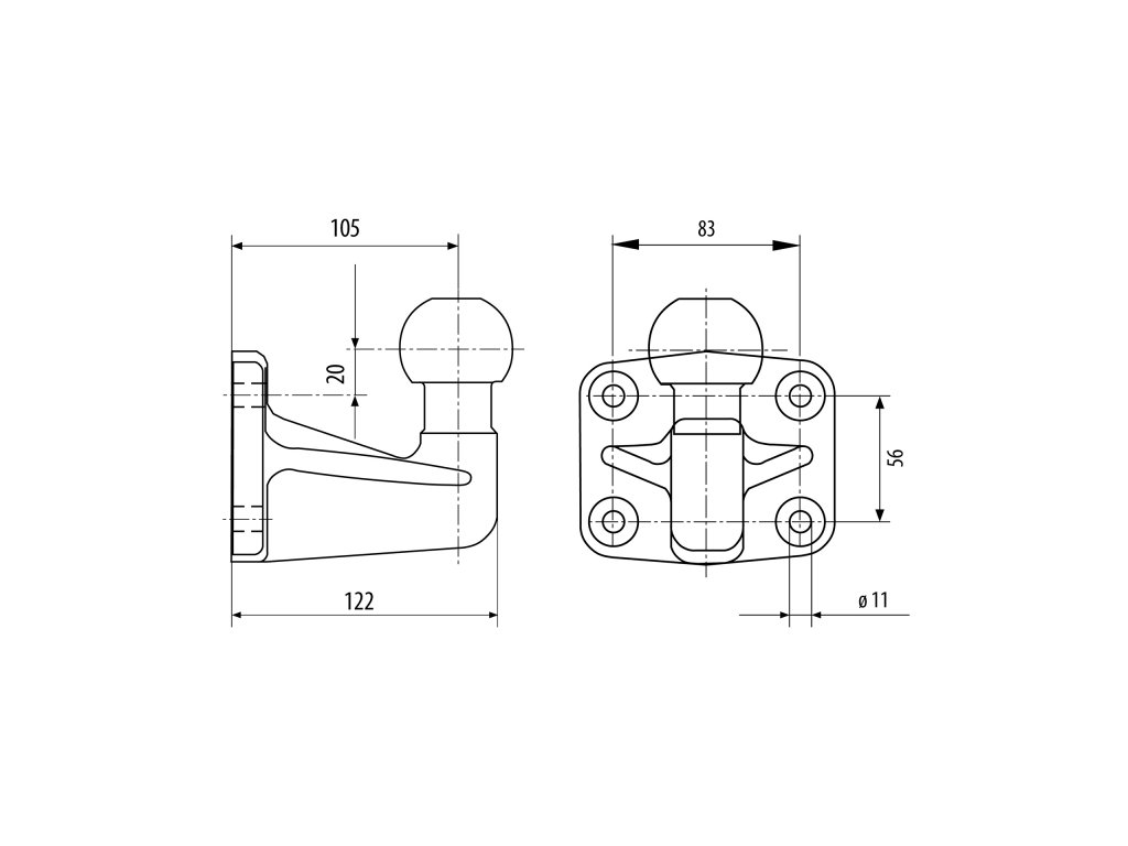 Rozteč otvorů: 83x56mm, Průměr otvorů 12,5mm. Zvýšený o 20mm (ze středu horního otvoru na střed čepu).Bez pevnostních šroubů.