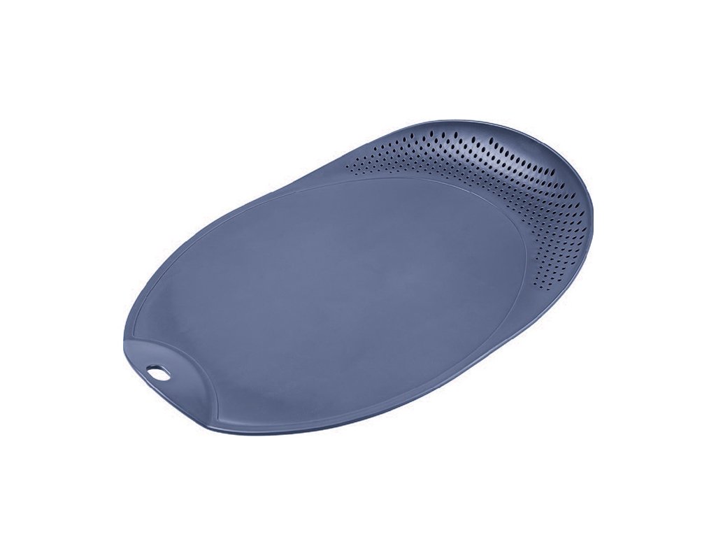 Originální oválné plastové prkénko s cedníkem a očkem na zavěšení.Prkénko je možné používat ke krájení, cezení a umývání.