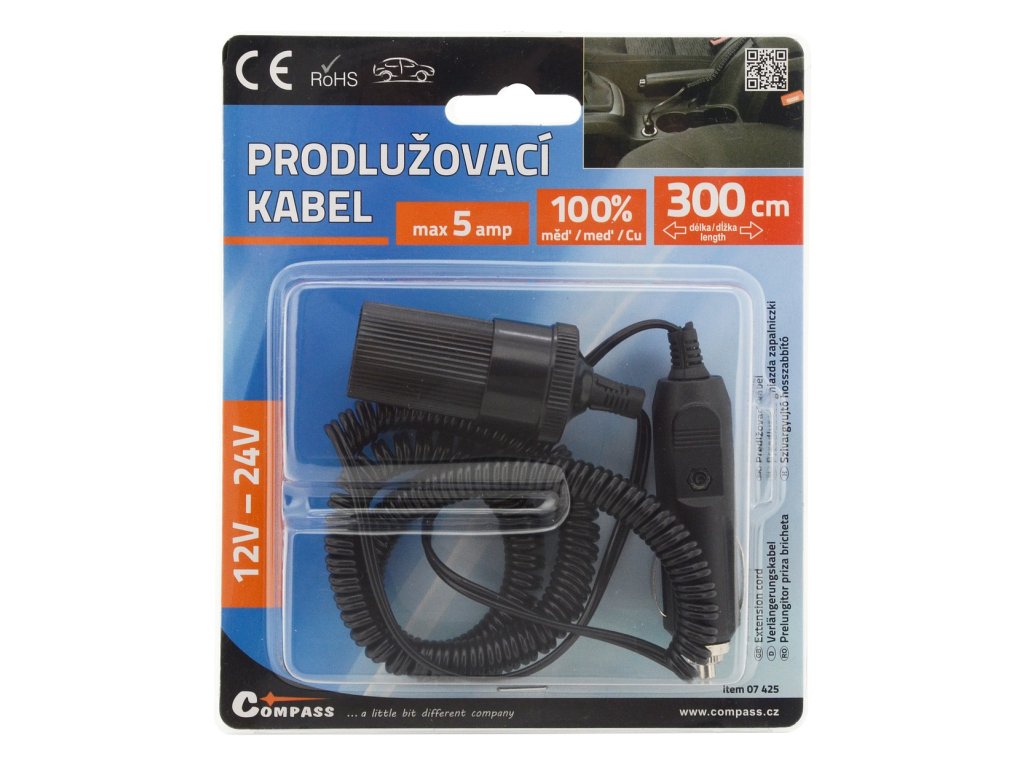 Prodlužovací kabel do zásuvky automobilového zapalovače 12V nebo 24V.