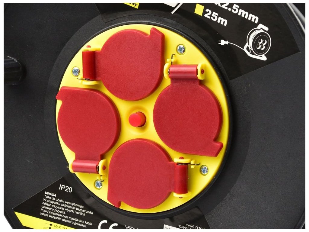Prodlužovací kabel na plastovém bubnu se čtyřmi zásuvkami s dětskou a tepelnou pojistkou, uzemněný, je ideální pro každý dům, zahradu, dílnu a staveniště.