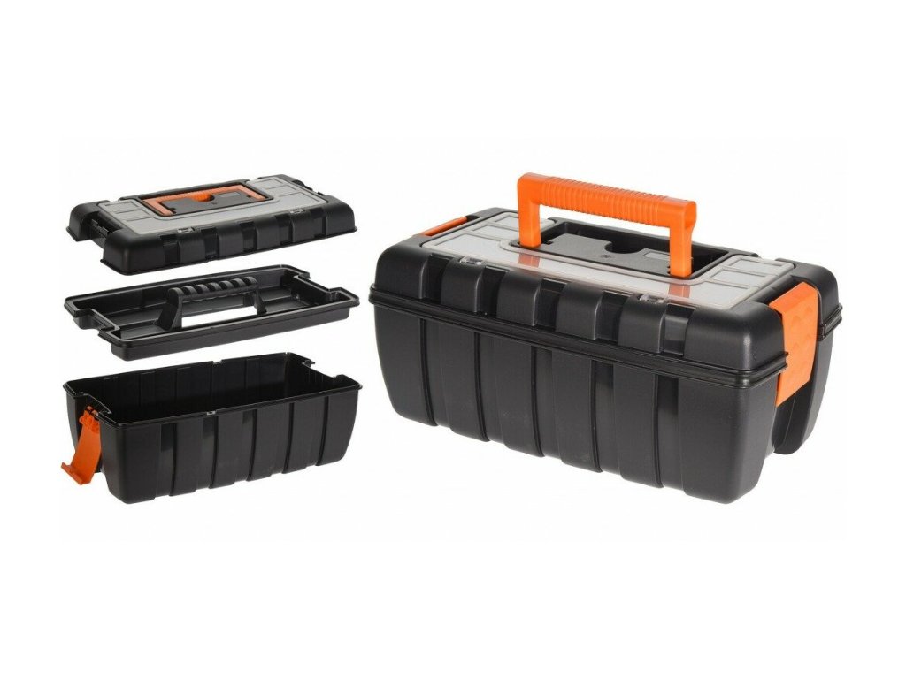 - prostorný přenosný kufr na nářadí z odolného plastu - materiál: tvrzený plast - dělený organizér ve víku umožňuje pohodlně skladovat i nejmenší součástky v několika přihrádkách - zároveň je ve vnitřní části boxu odnímatelná přihrádka pro volně ložené nářadí - horní rukojeť je sklopná, což se hodí při případném skladování nebo převážení boxu - spolehlivé zavírání na velké pevné klipsy - rozměry: 37 x 20 x 16 cm