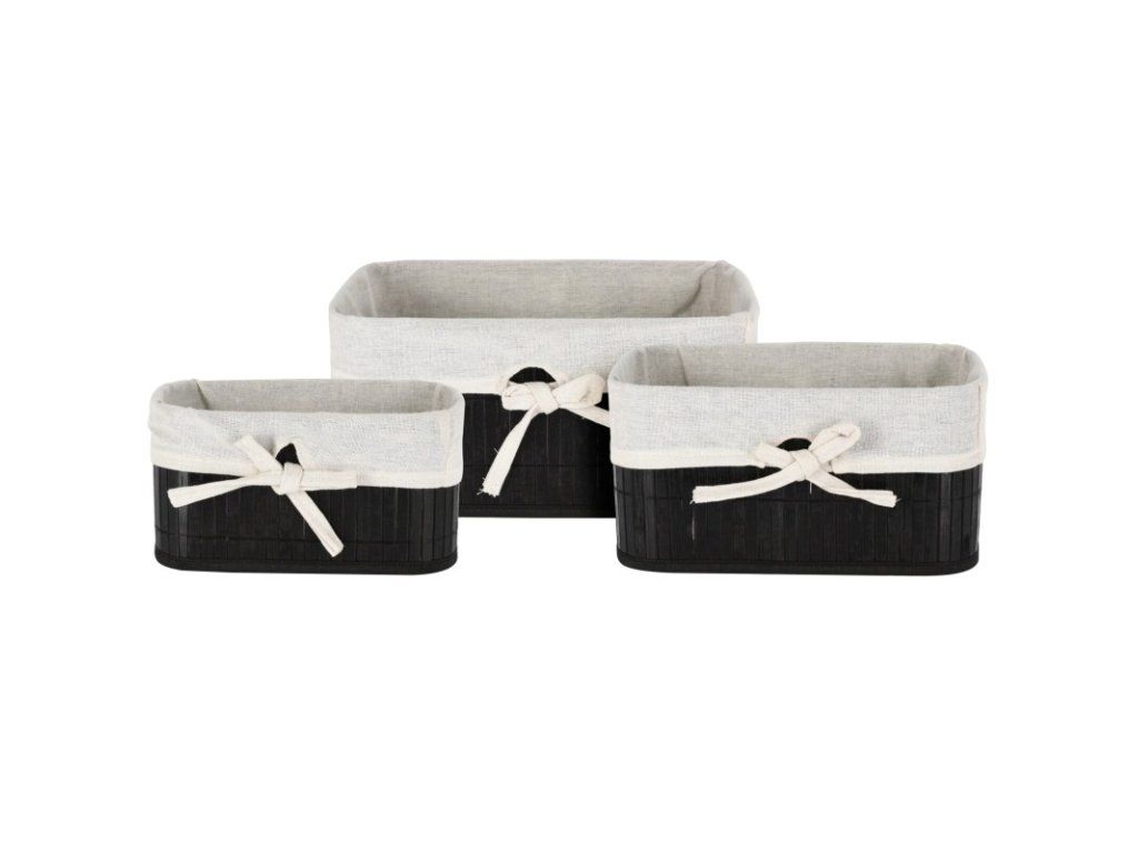 - materiál: bambus / bavlna- pevná konstrukce z bambusových lamel- přírodní materiál, který je lehký, ale přitom odolný, nepraská a má dlouhou životnost- košíky lze využít jako multifunkční úložný prostor pro skladování kosmetiky, hraček, oblečení, doplňků, šperků, potravin, atd..- jemný přírodní vzhled, který se hodí do každé místnosti- sada obsahuje 3 košíky ve třech velikostech:- malý: 24 x 14 x 12 cm- střední: 29 x 19 x 14 cm- velký: 34 x 24 x 16 cm- barva košíku: černáDoplňkové parametry